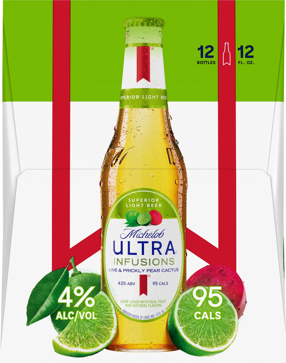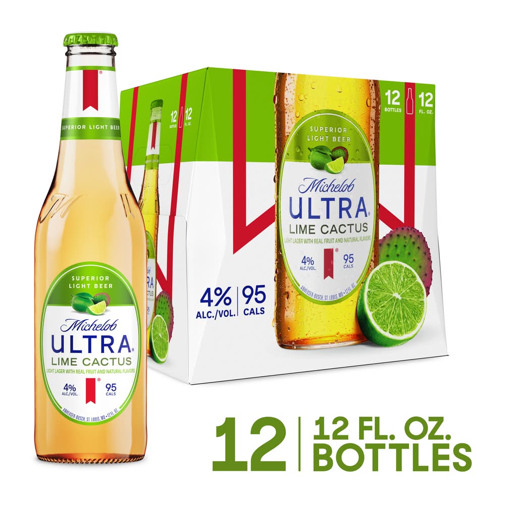 A light, refreshing combination of real exotic fruit and lime flavor, this beer packs flavor in every can. Michelob Ultra Lime Cactus has a truly tantalizing taste. The exotic fruit flavor aromas instantly transport you to an exotic getaway, while the clean citrus finish keeps it light and crisp. With only 95 calories per serving, it's an ideal choice for any occasion. Hard work deserves a superior light beer. • Flavor: Lime cactus • Pack size: 12 • Alcohol by volume: 4% • Anheuser Busch, St. Louis, Mo. • Packaging: Reusable