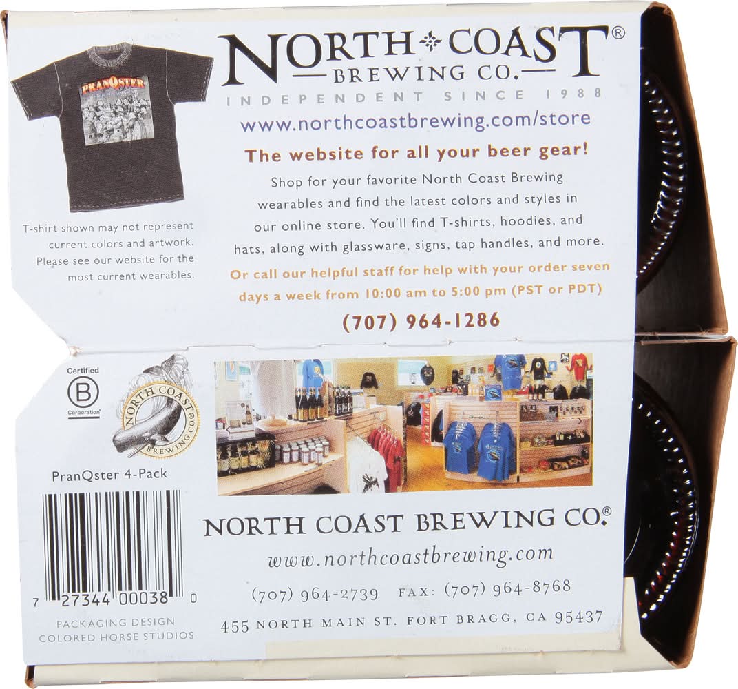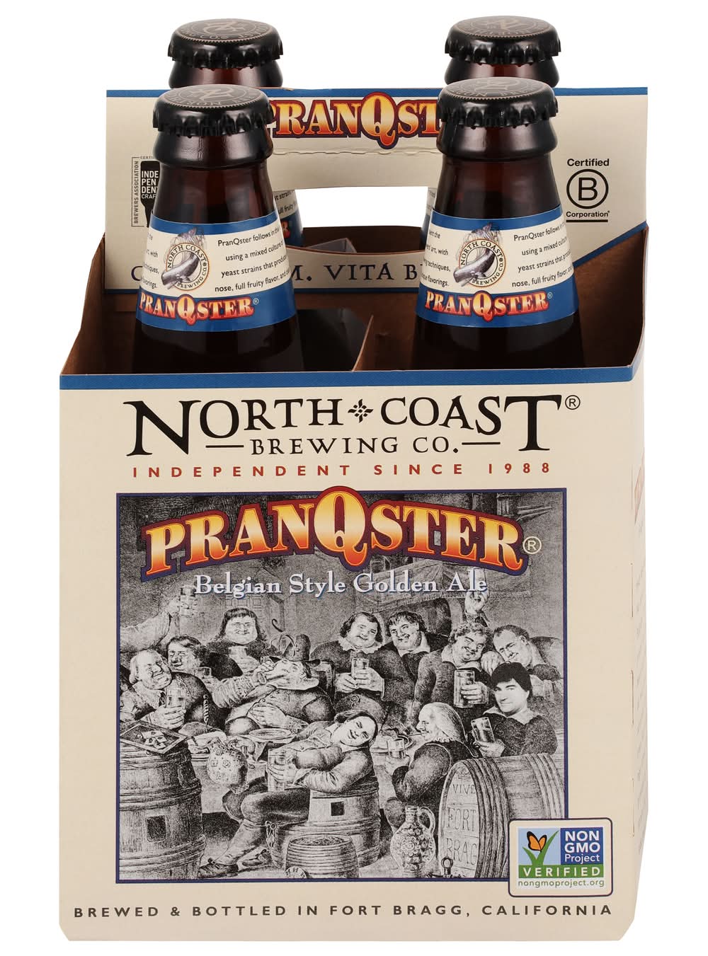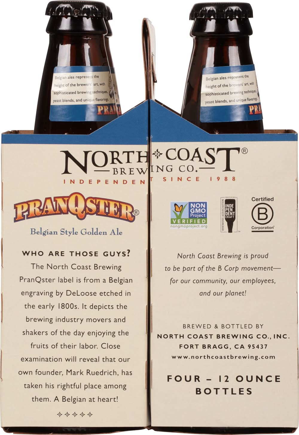 Non-GMO Project verified. nongmoproject.org. Belgian ales represent the height of the brewer's art, with sophisticated brewing techniqiues, yeast blends, and unique flavorings. Independent since 1988. Who Are Those Guys? The North Coast Brewing PranQster label is from a Belgian engraving by DeLoose etched in the early 1800s. It depicts the brewing industry movers and shakers of the day enjoying the fruits of their labor. Close examination will reveal that our own founder, Mark Ruedrich, has taken his rightful place among them. A Belgian at heart! T-shirt shown may not represent current colors and artwork. Please see our websites for the most current wearable. Packaging design colored horse studios. Brewers Association Certified Independent Craft. Certified B Corporation. North Coast Brewing is proud to be part of the B Corp movement- for our community, our employees, and our planet! The website for all your beer gear! Shop for your favorite North Coast Brewing wearables and find the latest colors and styles in our online store. You'll find T-shirts, hoodies, and hats, along with glassware, signs, tap handles, and more. Or call our helpful staff for help with your order seven days a week from 10:00 am to 5:00 pm. Alc./vol. 7.6% 15.2 Brewed & bottled in Fort Bragg, • Brand: North coast • Category: Belgian strong ale • Pack size: 4 • Alcohol by volume: 7.6%