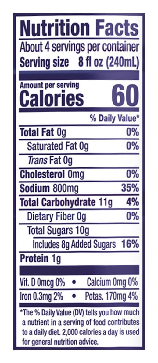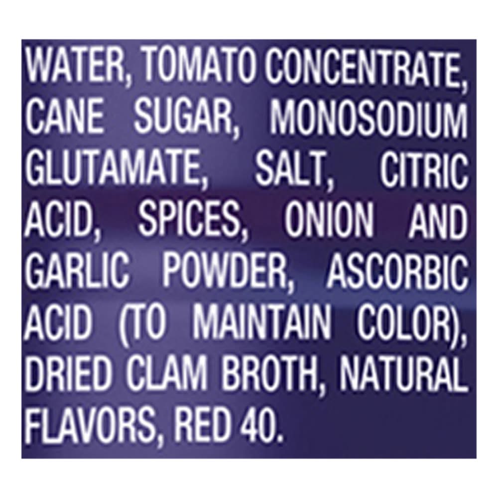 Ingredients: Water, Tomato Concentrate, Cane Sugar, Monosodium Glutamate, Salt, Citric Acid, Spices, Onion and Garlic Powder, Ascorbic Acid (to Maintain Color), Dried Clam Broth, Natural Flavors, Red 40