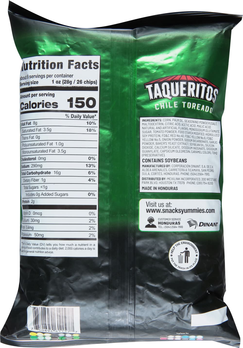 Naturally and artificially chili flavored rolled corn tortilla chips. Amount per serving: 150 calories; 3.5g sat. fat (18% DV); 290 mg sodium (13% DV); 1g sugar. Export quality. www.snacksyummies.com. Visit us at: www.snacksyummies.com. Customer service Honduras Tel: (504) 2564-7910. Help the environment. Put the trash in its place. Flavor: Chile toreado