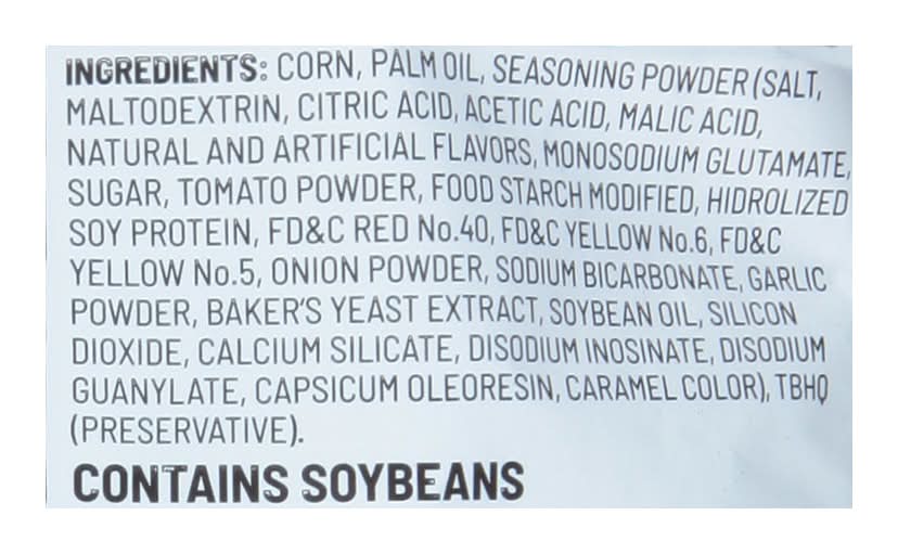 Ingredients: Corn, Palm Oil, Seasoning Powder (Salt Maltodextrin Citric Acid Acetic Acid Malic Acid Natural and Artificial Flavors Monosodium Glutamate Sugar Tomato Powder Food Starch Modified Hydrolyzed Soy Protein FD&C Red No.40 FD&C Yellow No.6 FD&C Yellow No.5 Onion Powder Sodium Bicarbonate Garlic Powder Baker's Yeast Extract Soybean Oil Silicon Dioxide Calcium Silicate Disodium Inosinate Disodium Guanylate Capsicum Oleo, TBHQ (Preservative) Contains: Soybeans, Corn