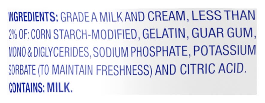 Ingredients: Grade A Milk and Cream, Less than 2% of: Corn Starch-Modified, Gelatin, Guar Gum, Mono & Diglycerides, Sodium Phosphate, Potassium Sorbate (to Maintain Freshness) and Citric Acid Contains: Milk, Corn