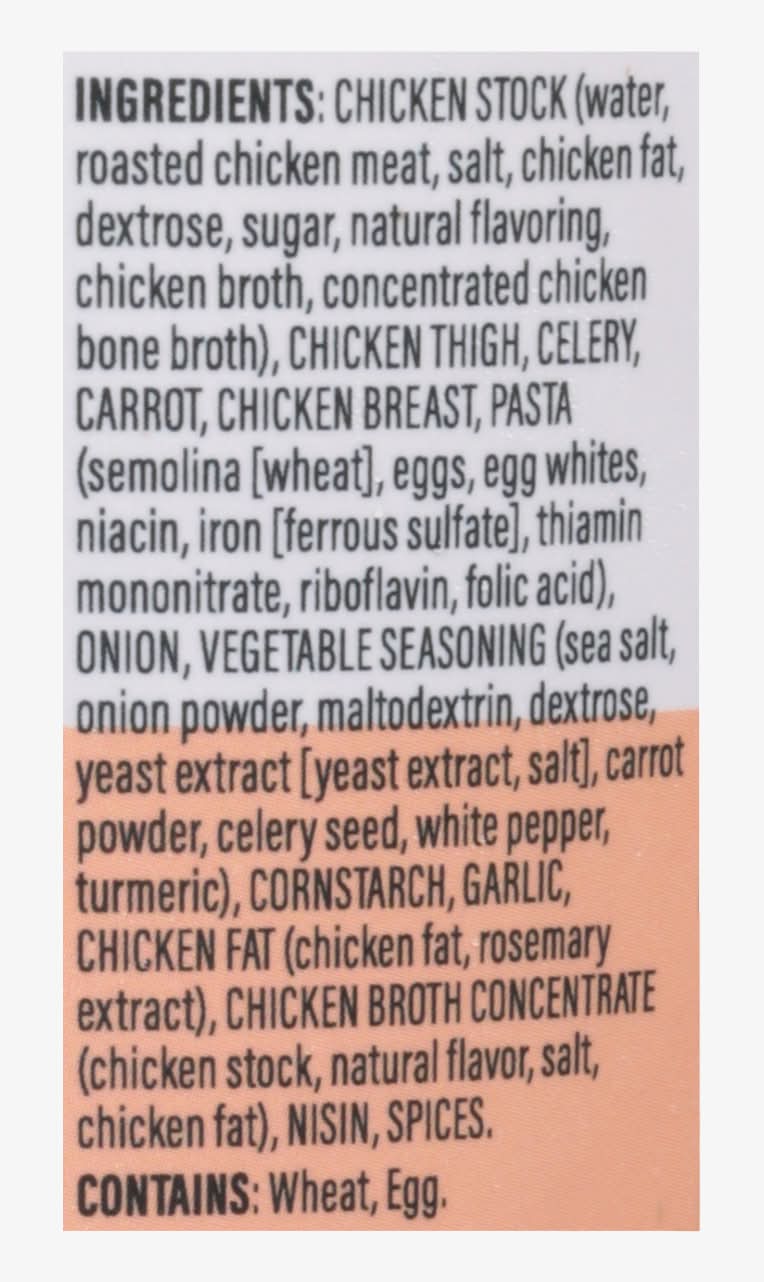 Ingredients: Chicken Stock (Water, Roasted Chicken Meat, Salt, Chicken Fat, Dextrose, Sugar, Natural Flavoring Chicken Broth, Concentrated Chicken Bone Broth), Chicken Thigh, Celery, Carrot, Chicken Breast, Pasta (Semolina [Wheat), Eggs, Egg Whites, Niacin, Iron [Ferrous Sulfate), Thiamin Mononitrate, Riboflavin, Folic Acid), Onion, Vegetable Seasoning (Sea Salt, Onion Powder, Maltodextrin, Dextrose, Yeast Extract [Yeast Extract, Salt, Carrot Powder, Celery Seed, White Pepper, Turmeric), Cornstarch, Garlic, Chicken Fat (Chicken Fat, Rosemary Extract), Chicken Broth Concentrate (Chicken Stock, Natural Flavor, Salt, Chicken Fat), Nisin, Spices Contains: Eggs, Wheat, Celery, Corn