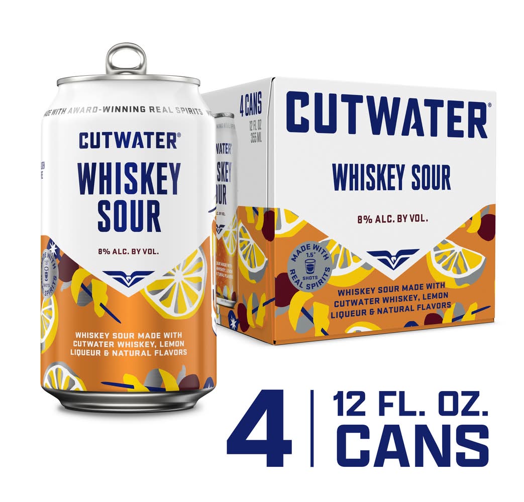 Cutwater Whiskey Sour. A Tart Tradition. Real Whiskey. Featuring our award-winning whiskey and lemon liqueur. Enjoy over ice in a rocks glass or straight from our can. • Flavor: Whiskey sour • Pack size: 4 • Alcohol by volume: 8%