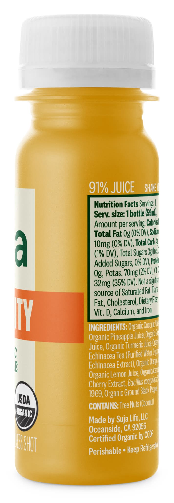 Support your immune health with the small but mighty Suja Organic Immunity Turmeric Pineapple Shot. Full of plant based ingredients like organic ginger, turmeric, organic orange juice, organic pineapple juice and black pepper, this immunity shot is sure to give you the boost your body needs. Each immunity shot provides turmeric, echinacea and live probiotics to help support digestive health.* Pineapple meets turmeric for next-level immune support. Just give the turmeric shot a shake, drink it in one or two sips, and enjoy the immune defense benefits. Take an immune support shot before breakfast, school, traveling, or any time your body needs a boost. Suja Organic Immunity juice shots are non-GMO, vegan and gluten free. In this wellness shot, we make next-level nutrition because if you are going to sip something, you ought to make it count. *As part of a balanced diet and healthy lifestyle • Flavor: Turmeric pineapple • Suja Life, LLC, Oceanside, CA, 92056 • Packaging: Reusable