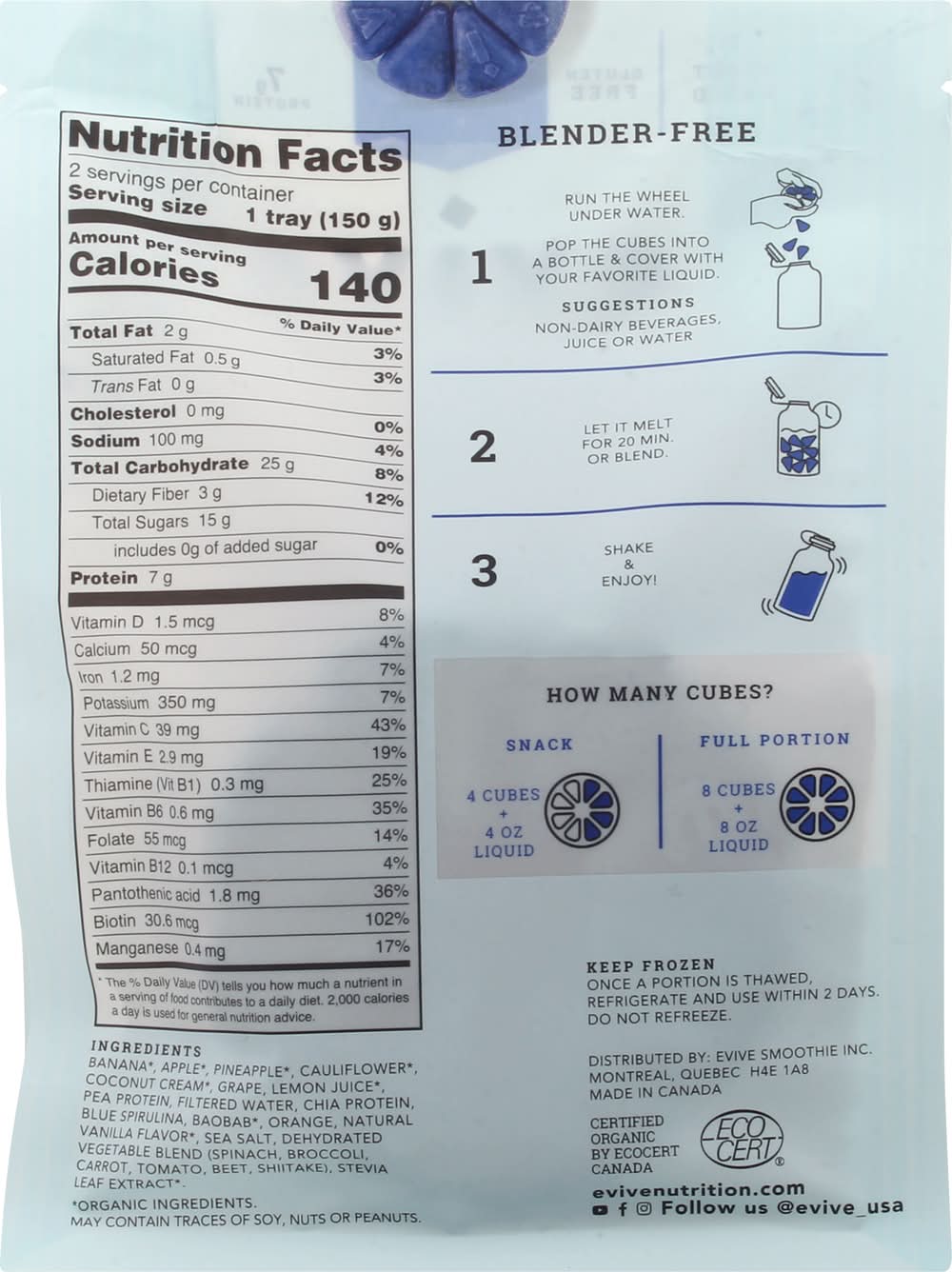 Ingredients: Banana (Organic Ingredients), Apple (Organic Ingredients), Pineapple (Organic Ingredients), Cauliflower (Organic Ingredients), Coconut Cream (Organic Ingredients), Grape, Lemon Juice (Organic Ingredients), Pea Protein, Filtered Water, Chia Protein, Blue Spirulina, Baobab (Organic Ingredients), Orange, Natural Vanilla Flavor (Organic Ingredients), Sea Salt, Dehydrated Vegetable Blend (Spinach, Broccoli, Carrot, Tomato, Beet, Shiitake), Stevia Leaf Extract (Organic Ingredients) Contains: Soybeans, Peanuts, Tree Nuts