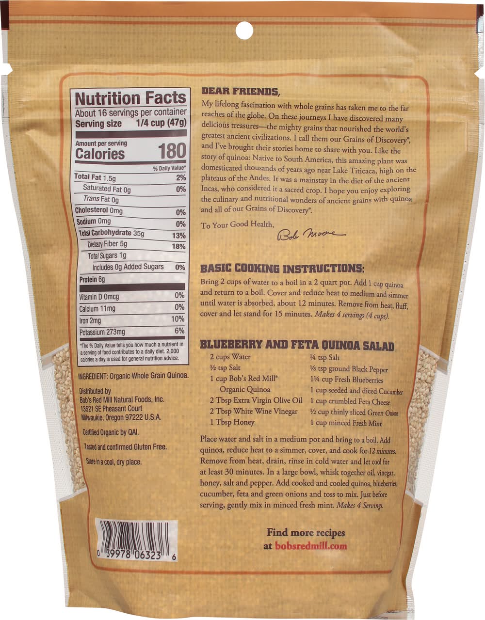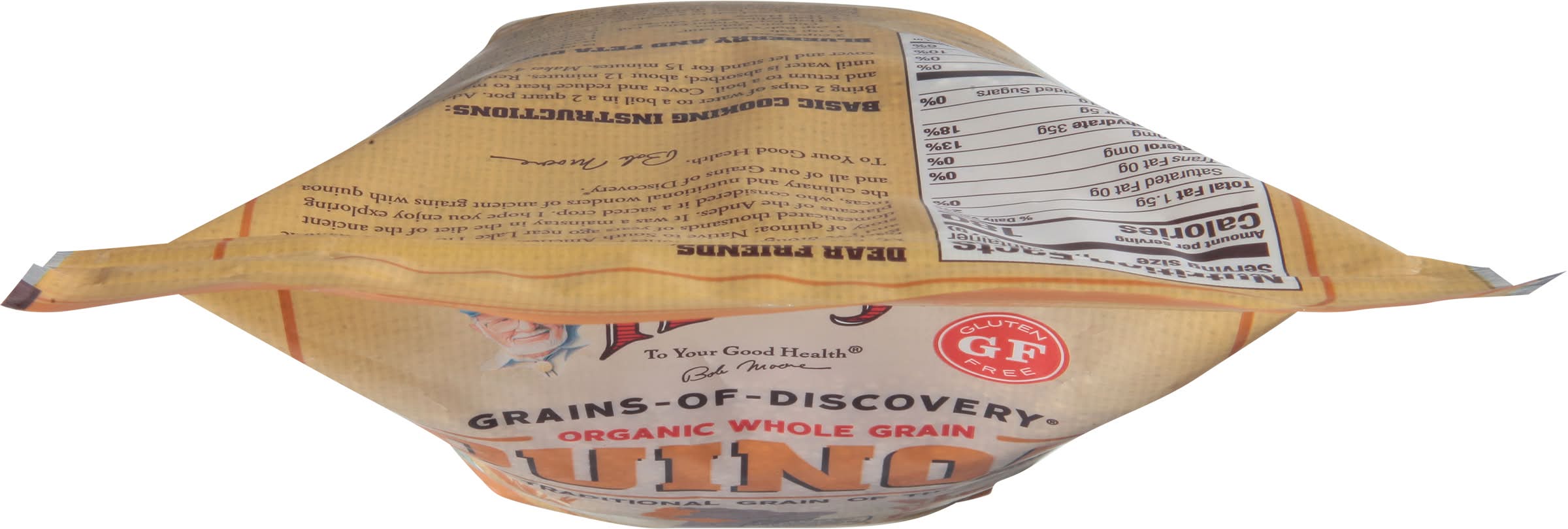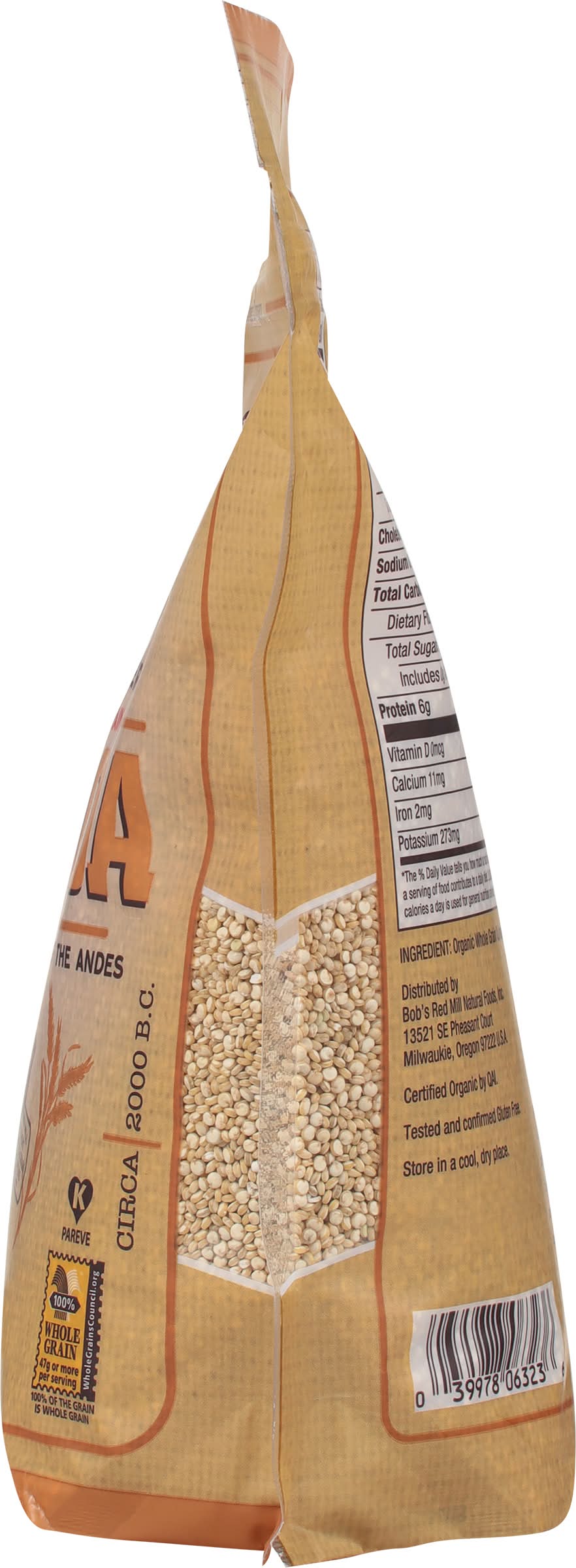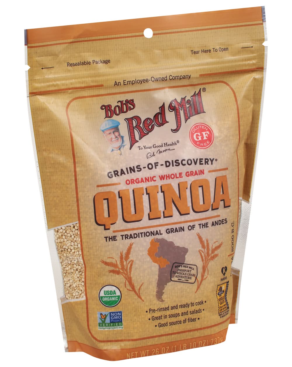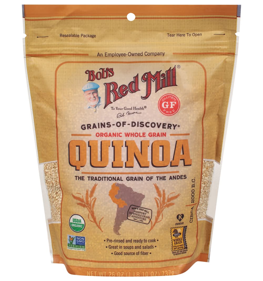 The traditional grain of the andes. Pre-rinsed and ready to cook. Great in soups and salads. Good source of fiber. An employee-owned company. To your good health. - Bob Moore. Grains of discovery. Gluten free. USDA Organic. 100% Whole Grain: 47 g or more per serving. 100% of the grain is whole grain. WholeGrainsCouncil.org. Bob's red mill passport to whole grain adventure. Circa. 2000 BC. Certified Organic by QAI. Tested and confirmed Gluten free in our quality control laboratory. Dear friends, My lifelong fascination with whole grains has taken me to the far reaches of the globe. On these journeys I have discovered many delicious treasures - the mighty grains that nourished the world's greatest ancient civilizations. I call them our Grains of Discovery, and I've brought their stories home to share with you. Like this story of quinoa. Native to South America, this amazing plant was domesticated thousands of years ago near Lake Titicaca, high on the plateaus of the Andes. It was a mainstay in the diet of the ancient Incas, who considered it a sacred crop. I hope you enjoy exploring the culinary and nutritional wonders of ancient grains with quinoa and all of our Grains of Discovery. To your good health, Bob Moore. Sourced Non-GMO Pledge: For more information on our Sourced Non-GMO Pledge, Bobs Red Mill Natural Foods, 13521 SE Pheasant Court Milwaukie, OR 97222 USA