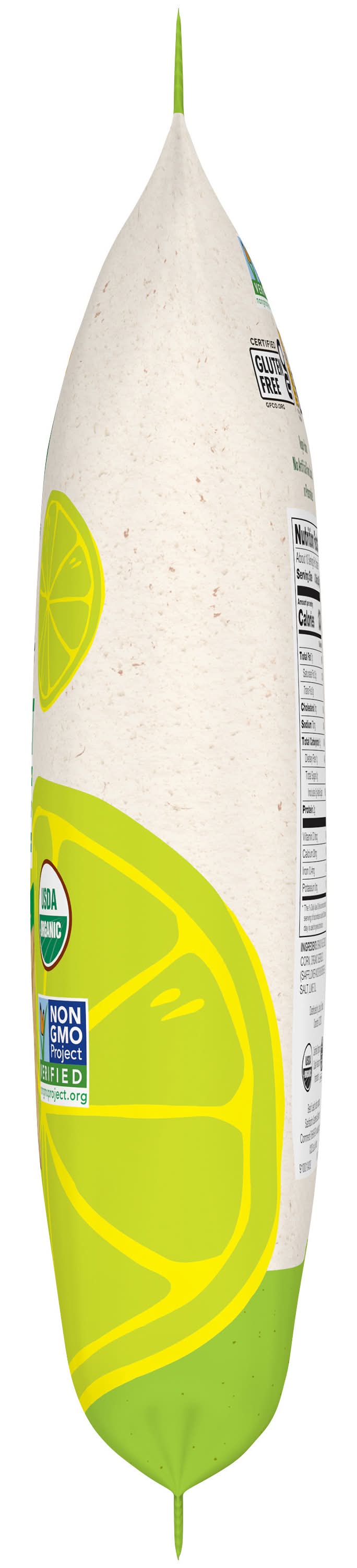 Ingredients: INGREDIENTS: ORGANIC WHOLE GROUND CORN, ORGANIC VEGETABLE OIL (SAFFLOWER AND/OR SUNFLOWER), SEA SALT, LIME OIL. Contains: Corn