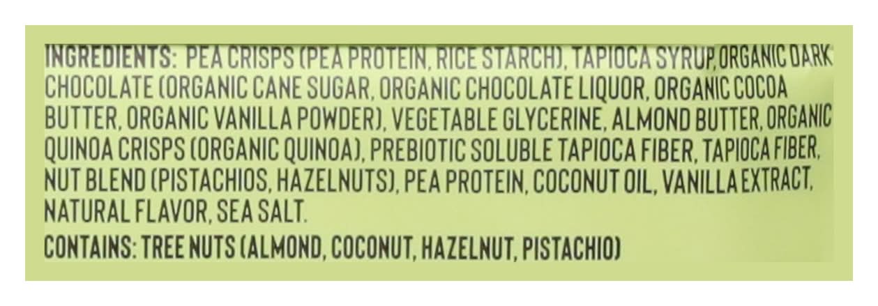 Ingredients: Pea Crisps (Pea Protein, Rice Starch), Tapioca Syrup, Organic Dark Chocolate (Organic Cane Sugar, Organic Chocolate Liquor, Organic Cocoa Butter, Organic Vanilla Powder), Vegetable Glycerine, Almond Butter, Organic Quinoa Crisps (Organic Quinoa), Prebiotic Soluble Tapioca Fiber, Tapioca Fiber, Nut Blend (Pistachios, Hazelnuts), Pea Protein, Coconut Oil, Vanilla Extract, Natural Flavor, Sea Salt Contains: Tree Nuts, Tree Nuts, Almonds, Tree Nuts, Coconuts, Tree Nuts, Hazelnuts/Filberts, Tree Nuts, Pistachios, Milk, Peanuts, Sesame, Soybeans, Tree Nuts, Eggs