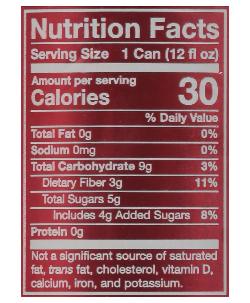 Ingredients: Sparkling Water, Organic Cane Sugar, Cassava Root Fiber, Organic Apple Cider Vinegar, Cherry Juice*, Natural Flavors, Lemon Juice*, Lime Juice*, Organic Agave Inulin, Stevia Leaf Extract. *Concentrate.