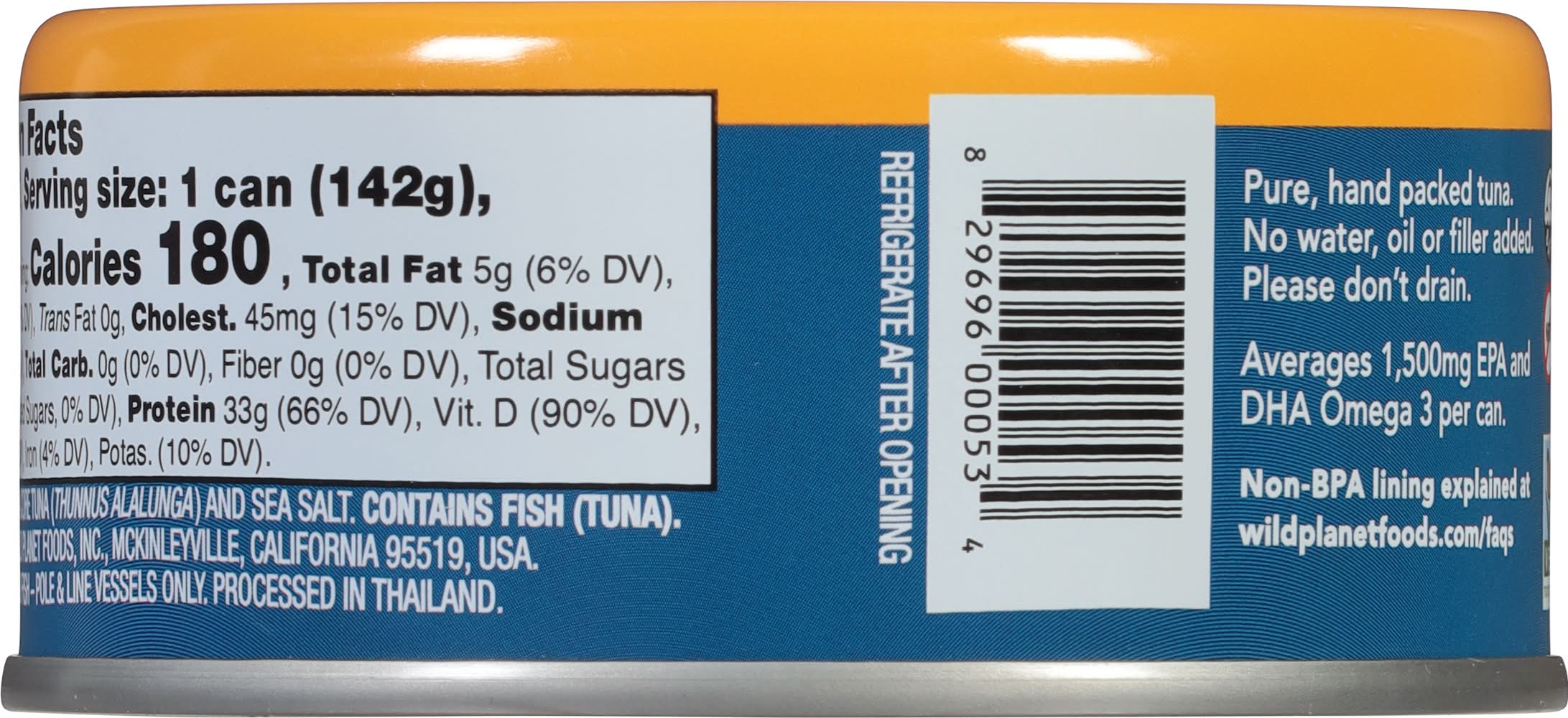 Each serving is made from 100% pure tuna seasoned with sea salt, and it is verified by The tuna is sustainably caught using pole and line methods, which are dolphin safe and do not involve long lines or nets, making it a turtle-safe choice. The albacore used are smaller, which is associated with lower mercury content. The product is hand-packed without the addition of water, oil, or fillers and should not be drained. Wild Planet Foods, Mckinleyville,CA,95519,USA