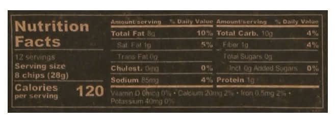 Ingredients: Whole Corn, Sunflower and/or Safflower Oil, Lime and Sea Salt