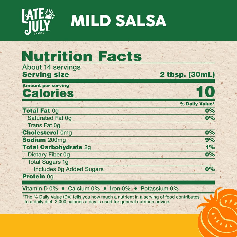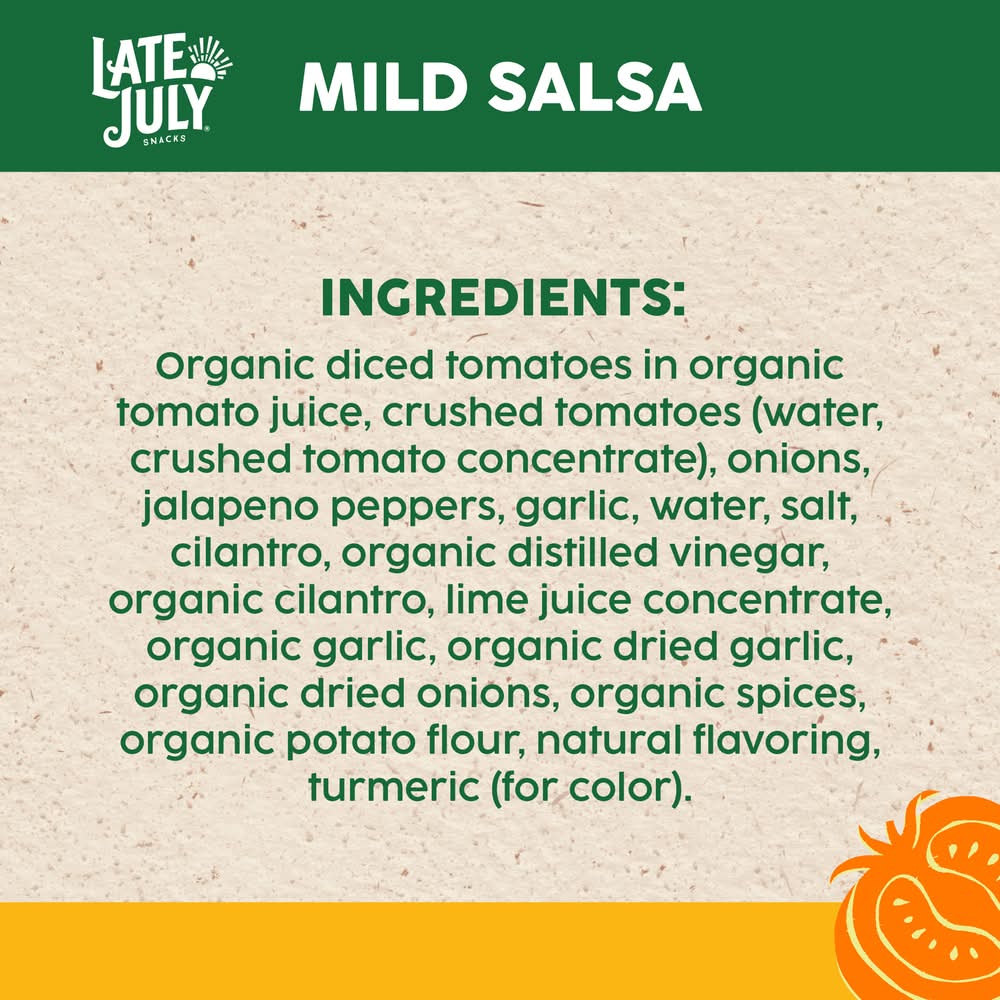 Late July Snacks Mild Salsa has a slight kick with bold flavors. This thick and chunky salsa is crafted with organic diced tomatoes, onions, garlic and jalapenos. The result is a hearty chunky salsa in a sofrito blended base that highlights the flavors of all the high-quality ingredients with a balance of spice, so everyone can enjoy this salsa dip. The best parties need a few simple things — great friends, great stories and delicious food. These three things always come back together around a big bowl of delicious Late July tortilla chips and a jar of our mild organic salsa. Each 15.5 oz jar of red salsa offers about 14 servings, perfect for sharing with family and friends. Elevate your taco dip, breakfast burritos and other favorites with our gluten free tomato salsa. It also makes the perfect addition to your favorite recipes, from chicken flautas to huevos rancheros. We care deeply about using the highest quality organic and non-GMO ingredients with no artificial flavors or preservatives, so you can enjoy snacks that are simple, pure and good. And we never sacrifice on taste. Unquestionable tasty goodness.