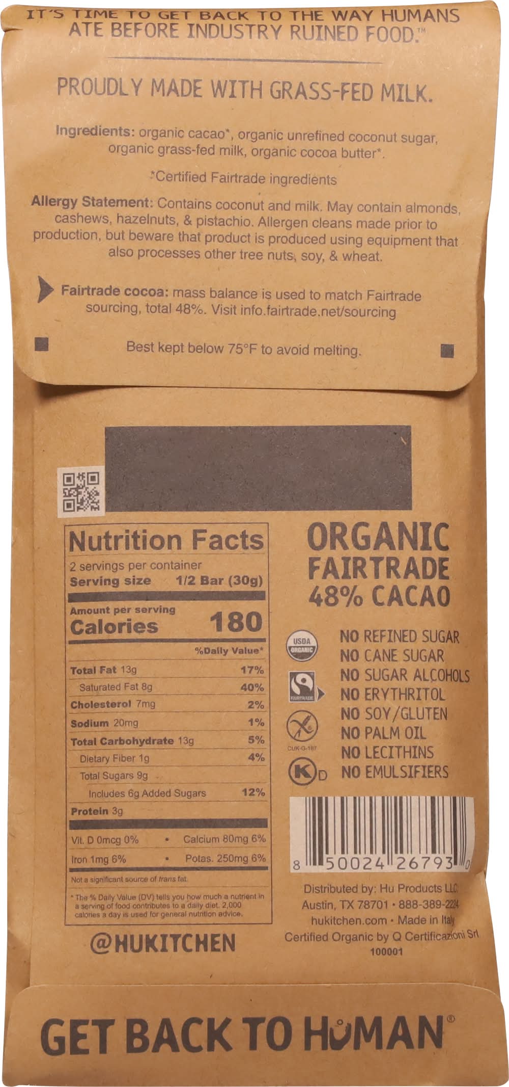 Organic grass-fed milk. USDA Organic. Certified Organic by Q Certification. No sugar alcohols. No erythritol. No soy/gluten. No palm oil. No lecithin's. No emulsifiers. Get back to human. No refined sugar.