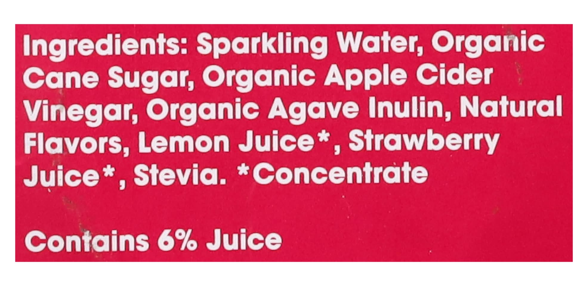 Ingredients: Sparkling Water, Organic Cane Sugar, Organic Apple Cider Vinegar, Organic Agave Inulin, Natural Flavors, Lemon Juice (Concentrate), Strawberry Juice (Concentrate), Stevia