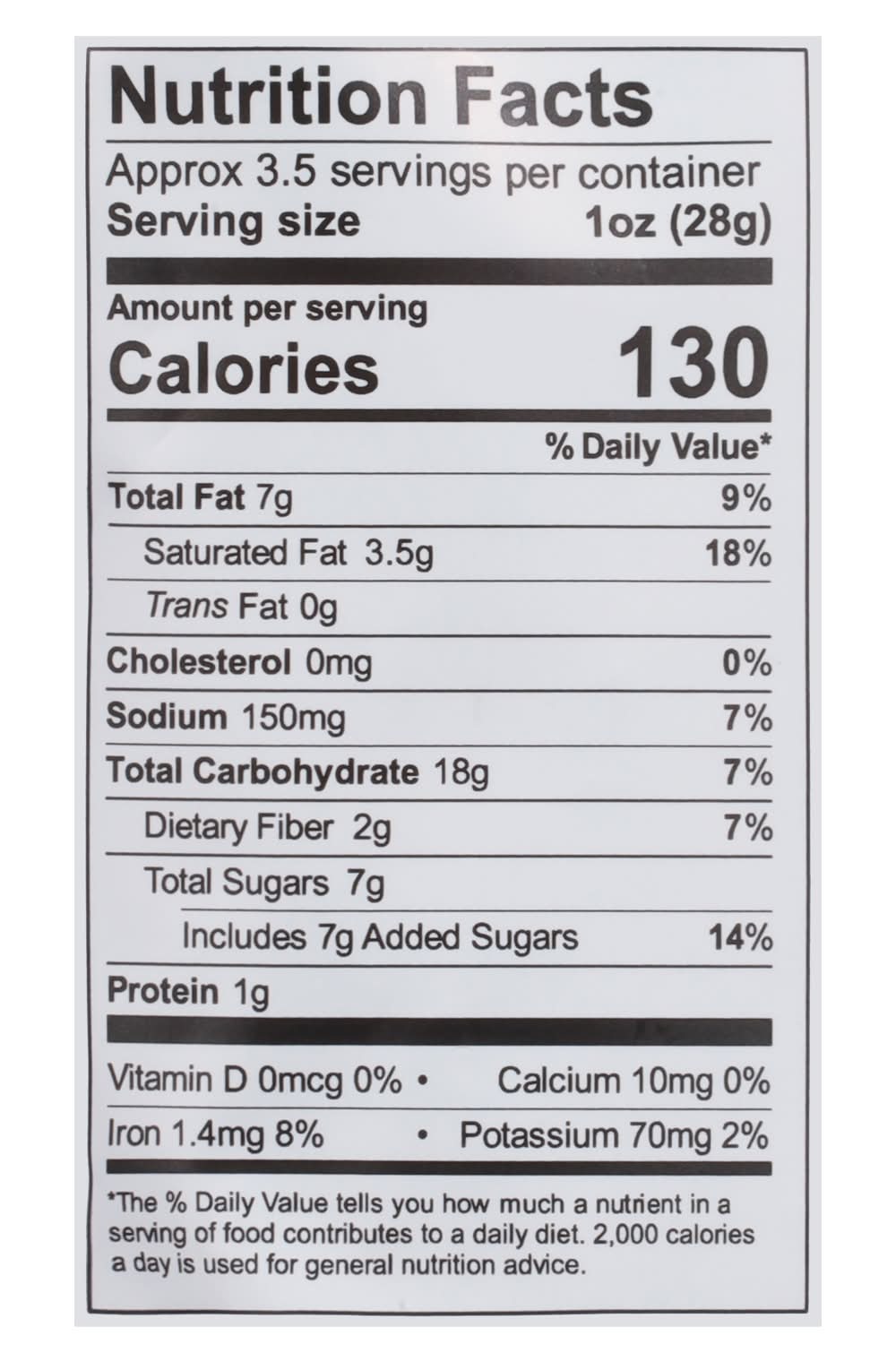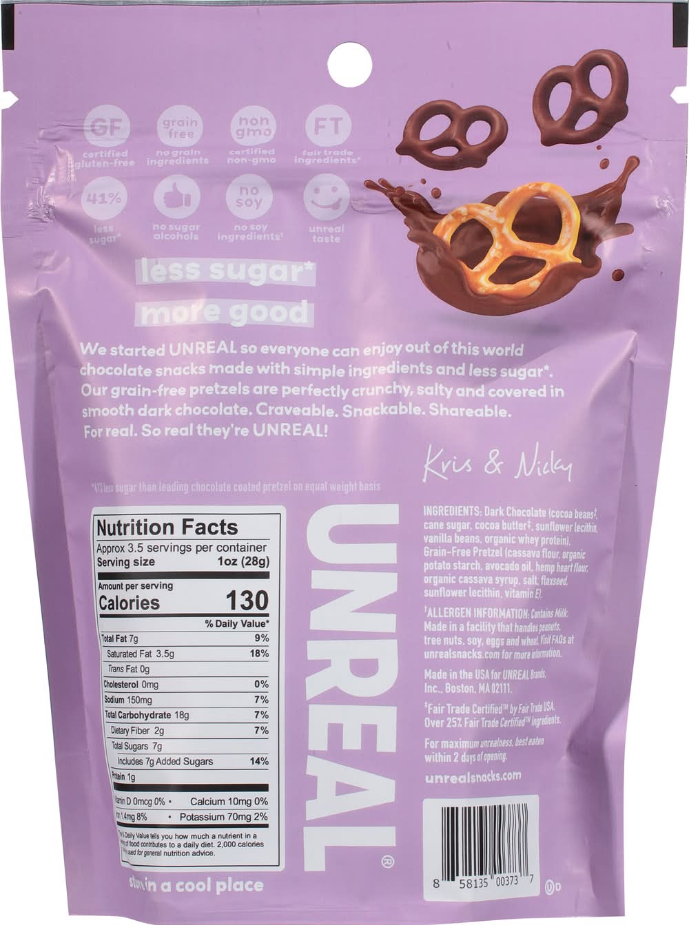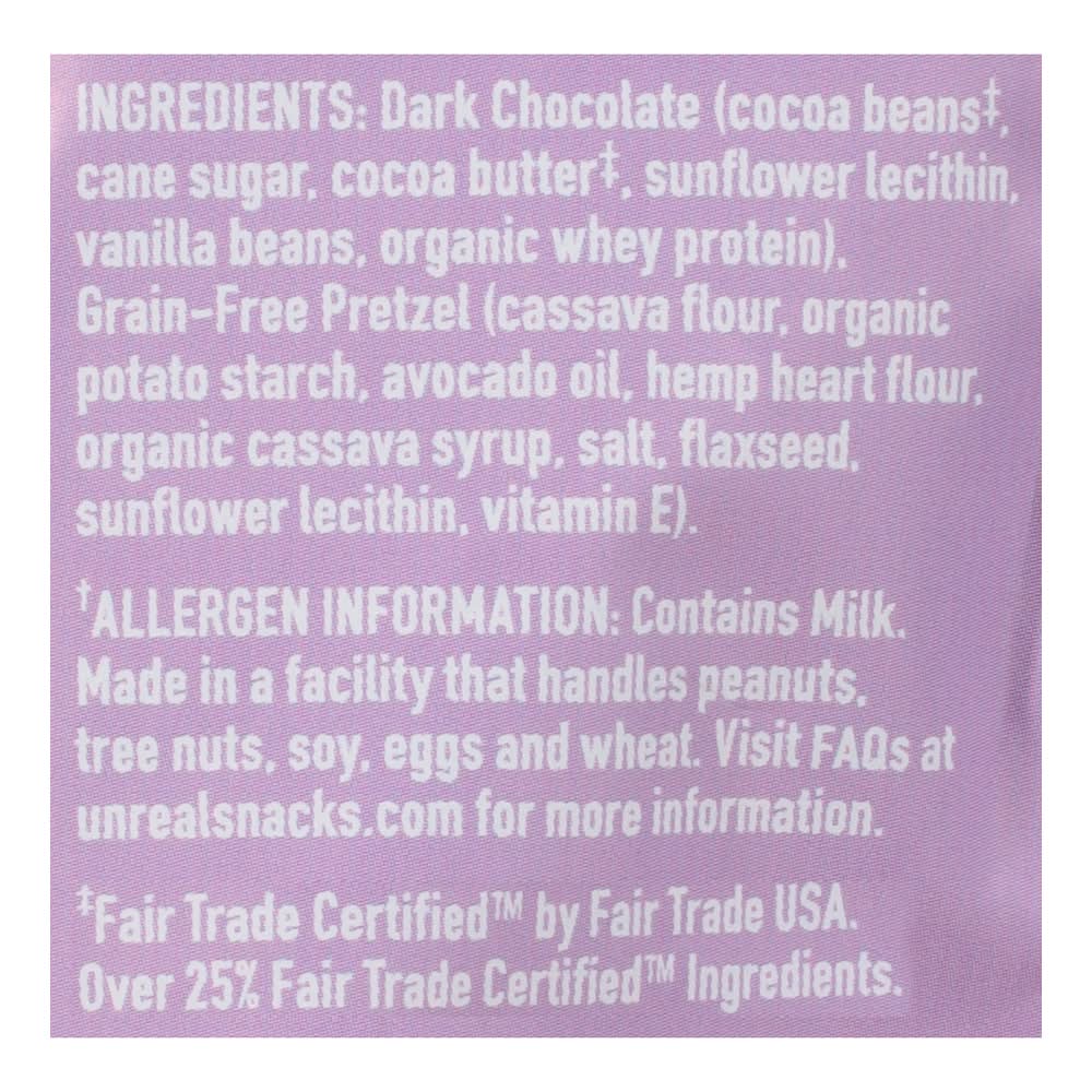 Ingredients: Dark Chocolate (Cocoa Beans (B), Cane Sugar, Cocoa Butter (B), Sunflower Lecithin, Vanilla Beans, Organic Whey Protein), Grain-Free Pretzel (Cassava Flour, Organic Potato Starch, Avocado Oil, Hemp Heart Flour, Organic Cassava Syrup, Salt, Flaxseed, Sunflower Lecithin, Vitamin E), (B) Fair Trade Certified by Fair Trade USA, Over 25% Fair Trade Certified Ingredients Contains: Milk, Peanuts, Tree Nuts, Soybeans, Eggs, Wheat