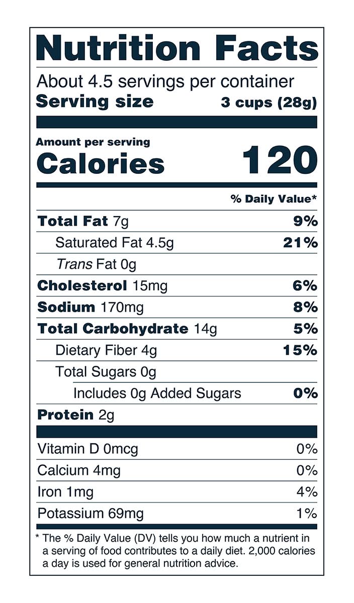 Ingredients: Organic Non-GMO Popcorn, Organic Ghee, Himalayan Salt Contains: Milk, Tree Nuts, Coconuts, Eggs