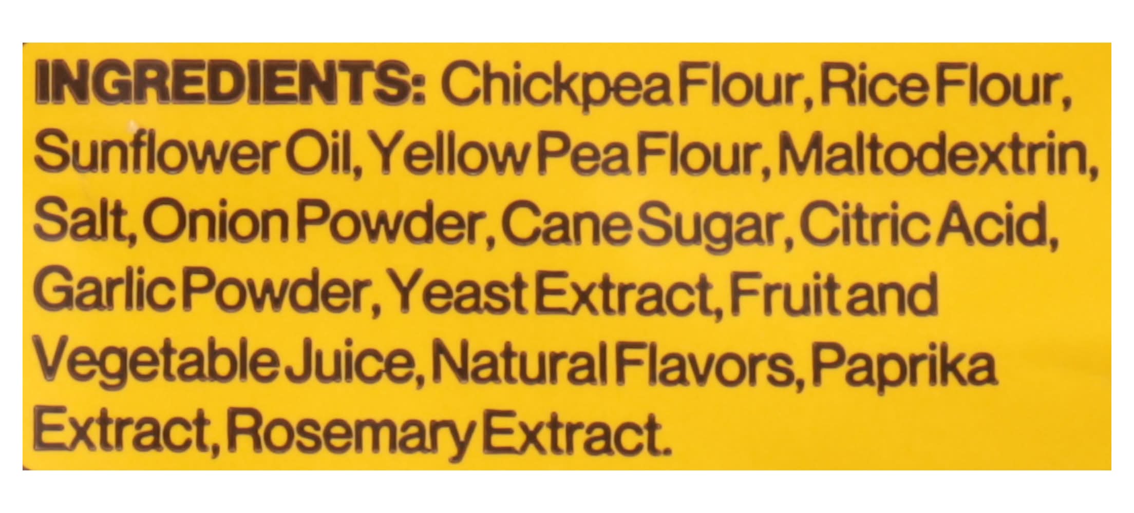 Ingredients: Chickpea Flour, Rice Flour, Sunflower Oil, Yellow Pea Flour, Maltodextrin, Salt, Onion Powder, Cane Sugar, Citric Acid, Garlic Powder, Yeast Extract, Fruit and Vegetable Juice, Natural Flavors, Paprika Extract, Rosemary Extract