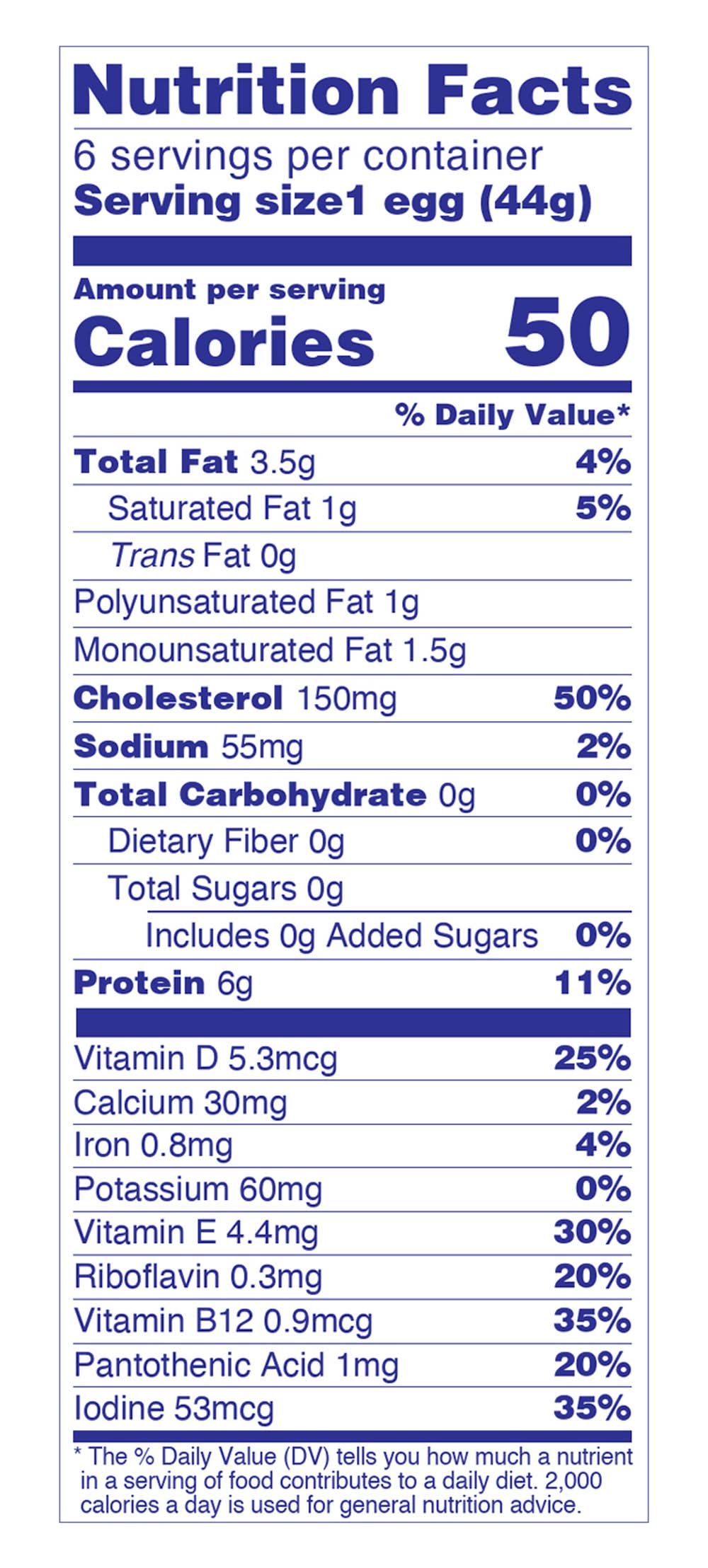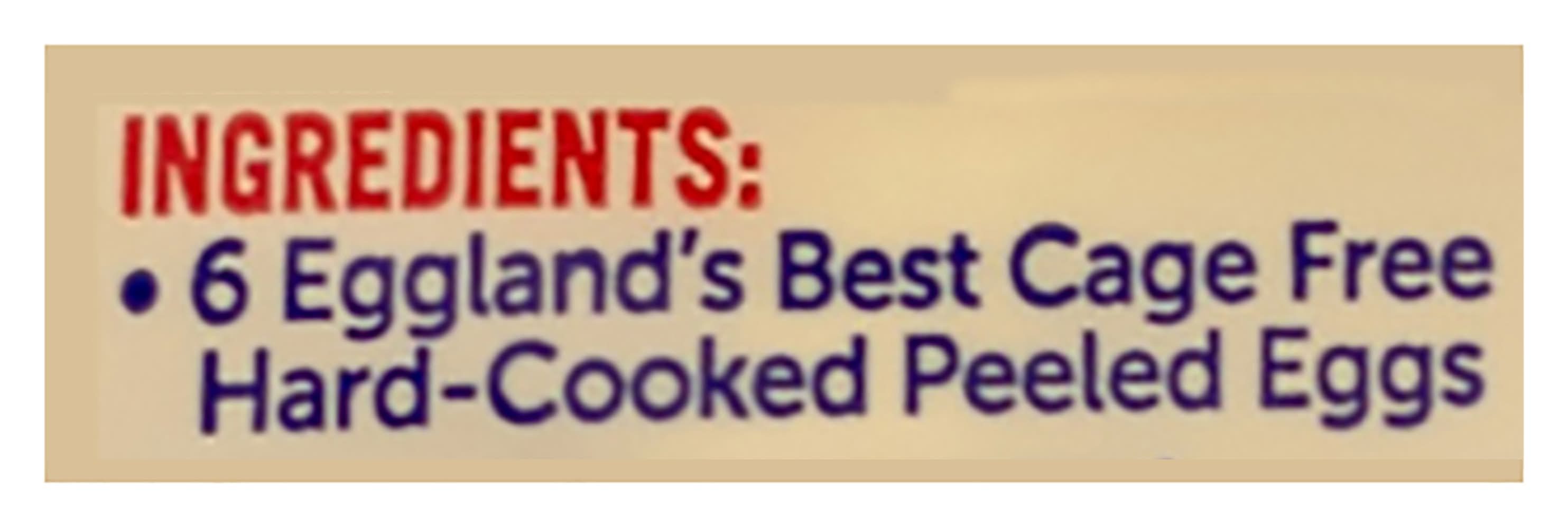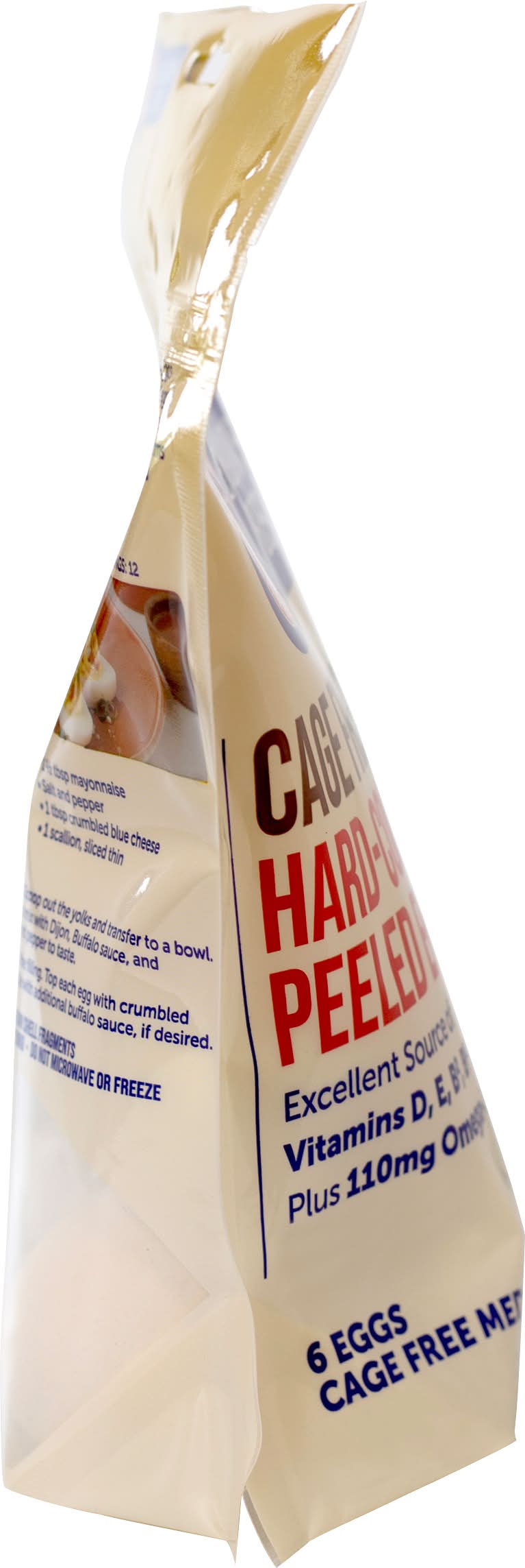 Great tasting! American Masters of Taste - Gold Superior Taste Perfect for egg salad, deviled eggs, creamed eggs, or as a snack. Now, America's best tasting eggs in a convenient pouch. 6 hard cooked Egg-land's Best Cage Free eggs, peeled and ready for use in your favorite recipe, with all the taste and nutrition you expect from Egg-land's Best eggs. • High in vitamins D, E and B12 • 110mg of omega 3 fatty acids • 25% less saturated fat than regular eggs (1g vs. 1.5g, quantities rounded). EB hens are fed a vegetarian diet. Recommended American Diabetes Association/American Dietetic Association dietary exchange: 1 Egg-land's Best egg for 1 medium-fat meat. Every hen selected to lay Egg-land's Best Cage Free eggs is free to roam in a pleasant, natural environment and is fed Egg-land's Best all-vegetarian diet. Produced in accordance with Egg-Land's Best, all vegetarian hen feeding program.
