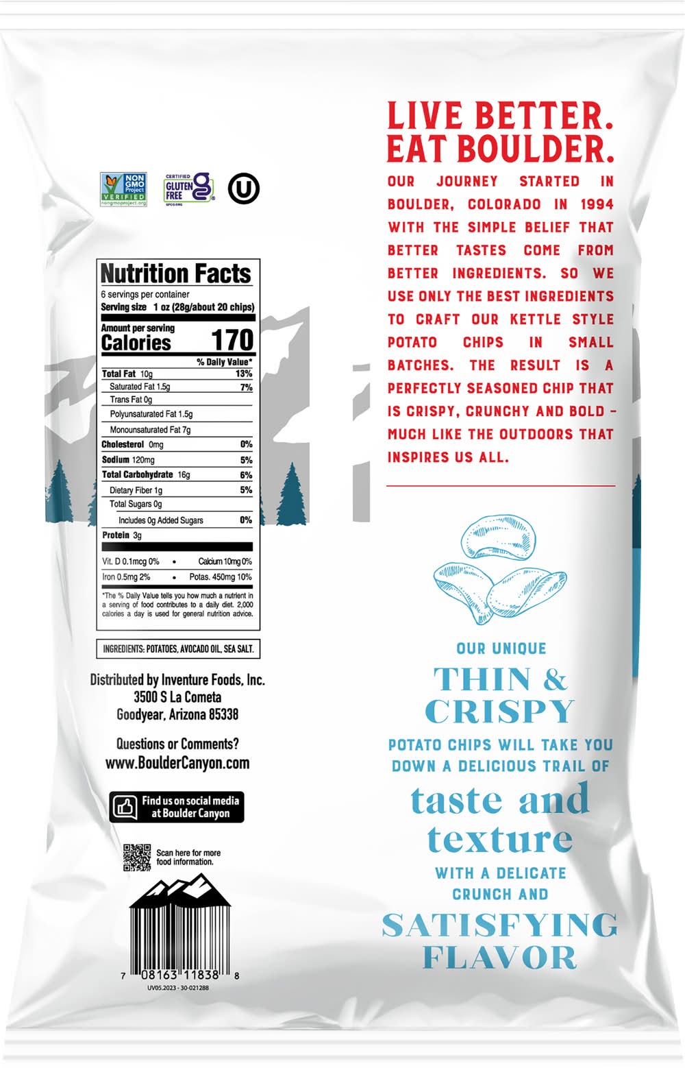 Certified gluten free. Non-GMO Project verified. nongmoproject.org. Est.1994. Live better. Eat Boulder. Our journey started in our Boulder, Colorado in 1994 with the simple belief that better tastes come from better ingredients, so we use only the best ingredients to craft our kettle style potato chips in small batches, the result is a perfectly seasoned chip that is crispy, crunchy and bold much like the outdoors that inspires us all. Our unique thin & crispy potato chips will take you down a delicious trail of taste and texture with a delicate crunch and satisfying flavor. • Flavor: Sea-salt • Inventure Foods, Inc., 3500 S La CometaGoodyear, AZ, 85338