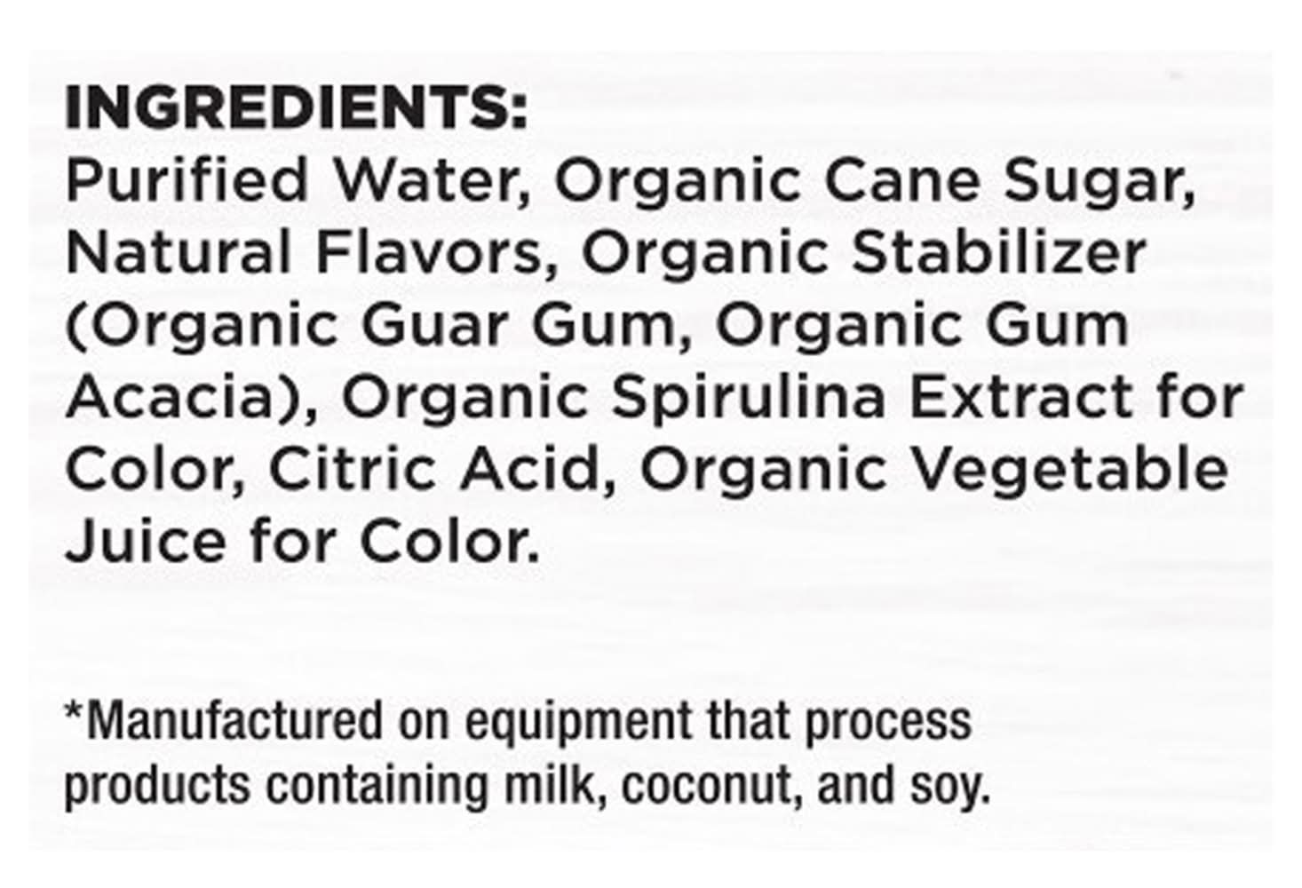 Ingredients: Purified Water, Organic Cane Sugar, Natural Flavors, Organic Stabilizer (Organic Guar Gum, Organic Gum Acacia), Organic Spirulina Extract for Color, Citric Acid, Organic Vegetable Juice for Color Contains: Milk, Tree Nuts, Coconuts, Soybeans