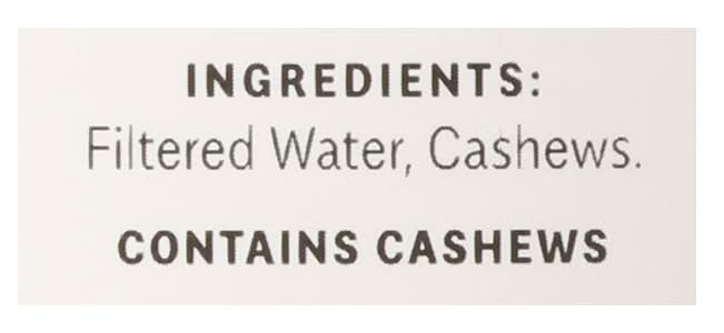 Ingredients: Filtered Water, Cashews Contains: Tree Nuts, Cashews