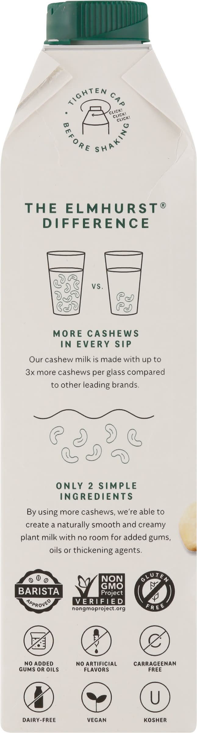 No added gums or emulsifiers. Smooth & creamy. Simple. Better. Plant milks the way they should be. After almost a century as a family-run New York City dairy, we decided to make the change to plant-based and have never looked back. With research, dedication, and a passion for a better future, we're bringing you the plant milks you deserve. Wholesome, clean and crafted with the simplest ingredients. It's Simpler. Better. From our family to yours. Enjoy. The Elmhurst Difference: More Cashews in Every Sip. Our cashew milk is made with up to 3x more cashews per glass compared to other leading brands. Only 2 Simple Ingredients: By using more cashews, we're able to create a naturally smooth and creamy plant milk with no room for added gums, oils or thickening agents. Packaging: Reusable