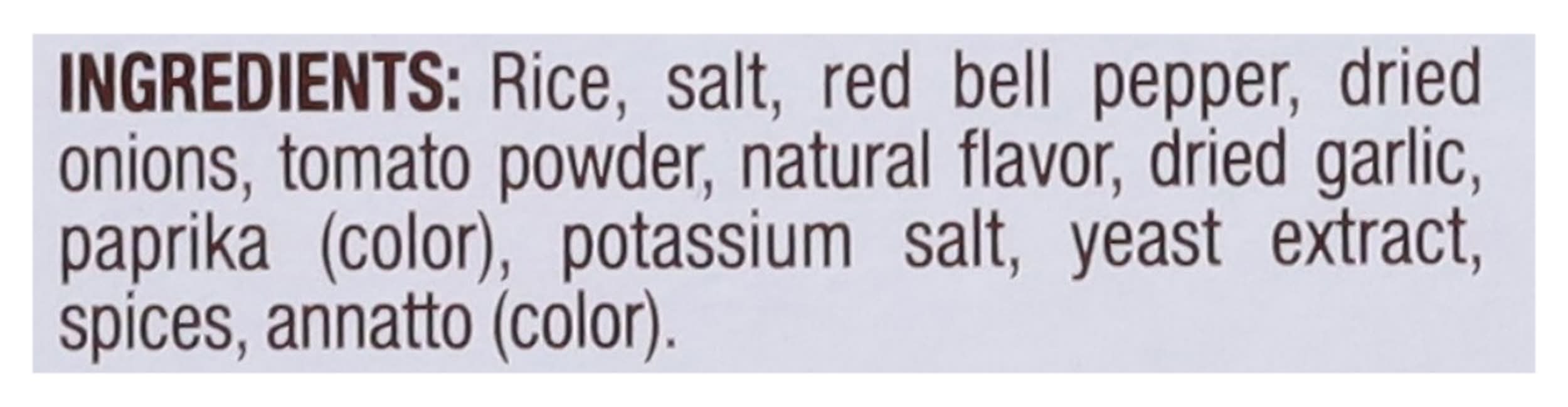 Ingredients: Rice, Salt, Red Bell Pepper, Dried Onions, Tomato Powder, Natural Flavor, Dried Garlic, Paprika (Color), Potassium Salt, Yeast Extract, Spices, Annatto (Color)