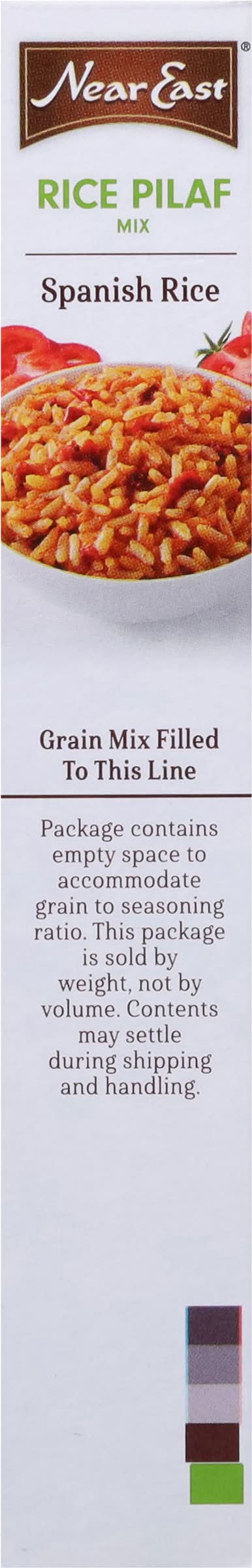 Per serving: 190 calories; 0 g sat fat (0% DV); 640 mg sodium (28% DV); 0 added sugars (0% DV).) Non-GMO Project verified. nongmoproject.org. Grain Mix Filled To This Line. Package contains empty space to accommodate grain to seasoning ratio. This package is sold by weight, not by volume. Contents may settle during shipping and handling. At Near East, we're inspired by how well the world eats. Our journey began 50 years ago with a single, homemade Armenian rice pilaf recipe. Today, the brand has expanded to a family of hearty grains, blended with vibrant spices and herbs from across the globe. Our simple yet flavorful dishes provide creative inspiration for any meal. • Flavor: Spanish rice • Near East Food Products, PO Box 049003, Chicago, IL. • Packaging: Reusable
