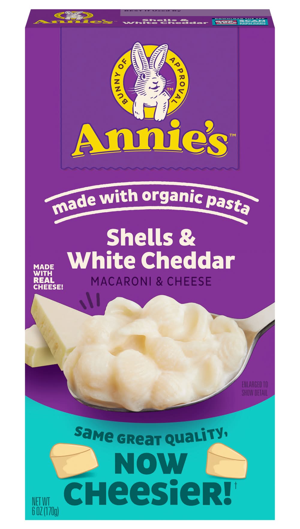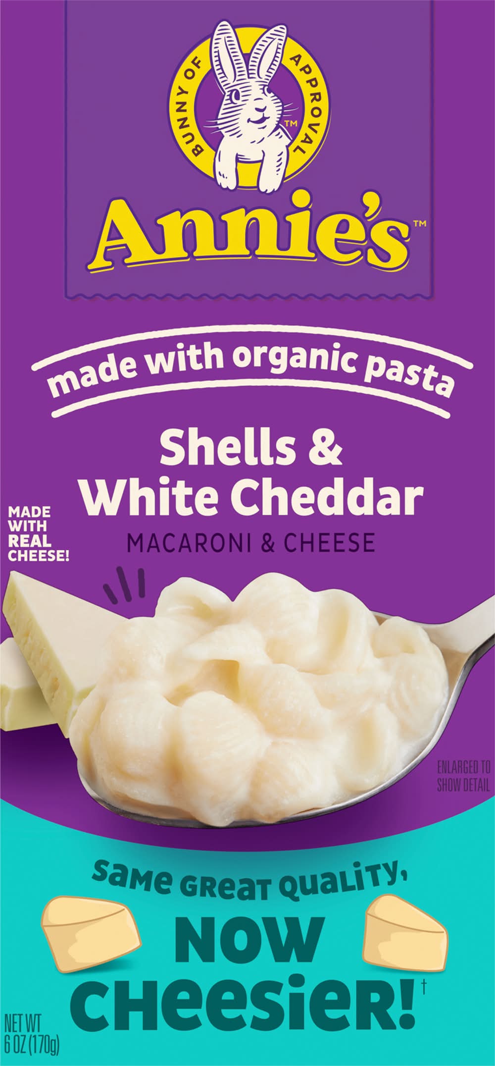 Bring creamy, cheesy goodness to your family dinner table with Annie's White Cheddar Shells and Mac and Cheese. Made with organic macaroni shells and real white cheddar cheese, It offers a great-tasting adult and kids dinner addition that's packed with flavor. With organic pasta contains cheese from cows not treated with rBST, offering quality ingredients in every bite. This pasta shells and cheese dinner side contains no artificial flavors or synthetic colors. It's ready in just ten minutes by following the simple steps on the package. This six-ounce box contains about two-and-a-half servings for a quick kids mac and cheese dinner option.For busy bunnies and families on the go, we help make life a little easier and more delicious by spreading goodness through tasty foods and kindness to the planet. Packaging: Reusable