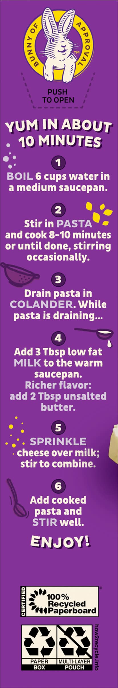 Directions for use: Yum in 10 Minutes 1. Boil 6 cups water in a medium saucepan. 2. Stir in Pasta and cook 8-10 minutes or until done, stirring occasionally. 3. Drain pasta in Colander. While pasta is draining... 4. Add 3 tbsp low fat Milk to the warm saucepan. Richer flavor: add 2 tbsp unsalted butter. 5. Sprinkle cheese over milk; stir to combine. 6. Add cooked pasta and Stir well. Enjoy! Storage recommendation: Store in a cool, dry place.