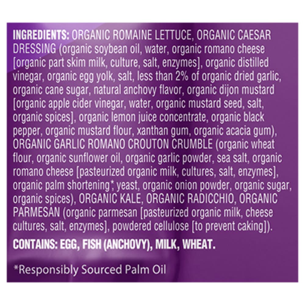 Ingredients: Organic Romaine Lettuce, Organic Caesar Dressing (Organic Soybean Oil, Water, Organic Romano Cheese [Organic Part Skim Milk, Culture, Salt, Enzymes], Organic Distilled Vinegar, Organic Egg Yolk, Salt, Less than 2% of Organic Dried Garlic, Organic Cane Sugar, Natural Anchovy Flavor, Organic Dijon Mustard [Organic Apple Cider Vinegar, Water, Organic Mustard Seed, Salt, Organic Spices], Organic Lemon Juice Concentrate, Organic Black Pepper, Organic Mustard Flour, Xanthan Gum, Organic Acacia Gum), Organic Garlic Romano Crouton Crumble (Organic Wheat Flour, Organic Sunflower Oil, Organic Garlic Powder, Sea Salt, Organic Romano Cheese [Pasteurized Organic Milk, Cultures, Salt, Enzymes], Organic Palm Shortening*, Yeast, Organic Onion Powder, Organic Sugar, Organic Spices), Organic Kale, Organic Radicchio, Organic Parmesan (Organic Parmesan [Pasteurized Organic Milk, Cheese Cultures, Salt, Enzymes], Powdered Cellulose [to Prevent Caking]). * Responsibly Sourced Palm Oil www.RSPO.org Contains: Eggs, Fish, Fish, Anchovy, Milk, Wheat, Mustard, Soybeans
