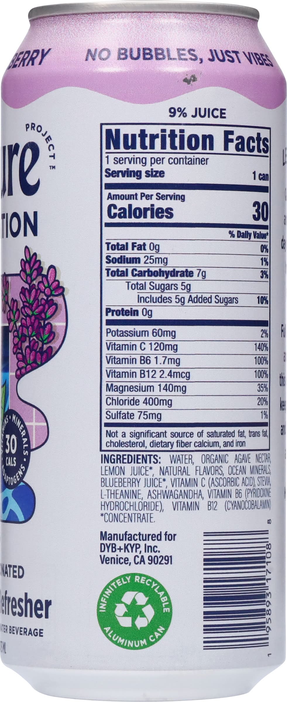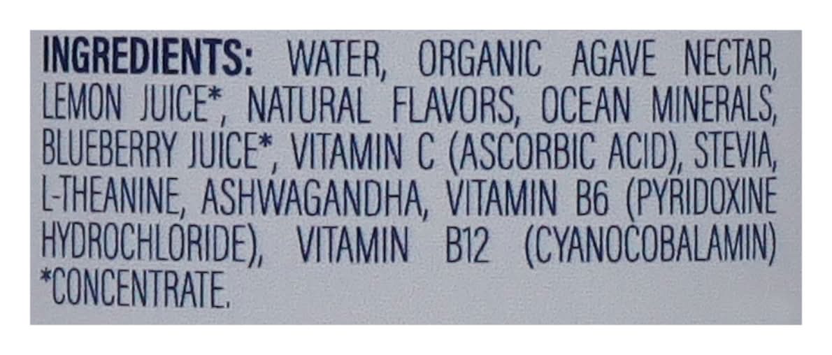 Ingredients: Water, Organic Agave Nectar, Lemon Juice (Concentrate), Natural Flavors, Ocean Minerals, Blueberry Juice (Concentrate), Vitamin C (Ascorbic Acid), Stevia, L-Theanine, Ashwagandha, Vitamin B6 (Pyridoxine Hydrochloride), Vitamin B12 (Cyanocobalamin)