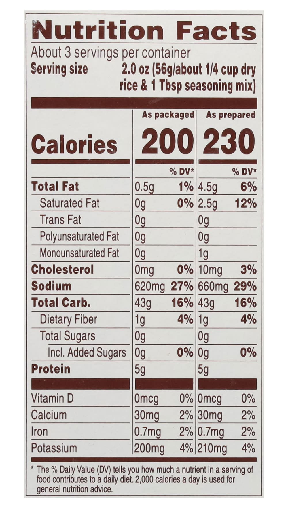 Safe handling instructions: this product is not ready-to-eat and must be thoroughly cooked before eating to prevent illness from potential bacteria in the product. do not eat or play with raw product; wash hands, utensils, and surfaces after handling. microwave: microwave directions: (1). in round 2-quart microwaveable glass casserole, combine rice, contents of spice sack, 2-1/4 cups water and 1 tablespoon olive oil or butter. (2). cover; microwave at high 18 to 21 minutes or until most of water is absorbed.(microwave ovens may vary. adjust times as needed). (3). let stand about 5 minutes or until all water is absorbed. (4). fluff pilaf lightly with fork before serving. range top directions: (1) in medium saucepan, bring 1-3/4 cups water and 1 tablespoon olive oil or butter just to a boil. (2) stir in rice and contents of spice sack. return to a boil. (3) cover; reduce heat to low. simmer 20 to 25 minutes or until most of water is absorbed. (4) fluff pilaf lightly with fork before serving. about 3 cups prepared. high altitude preparation: at high altitudes, increase water to 2-3/4 cups and cook time to 33 to 38 minutes. low fat directions: follow package directions, except omit olive oil or butter and add additional 3 tablespoons water. (see nutrition facts for sodium content.