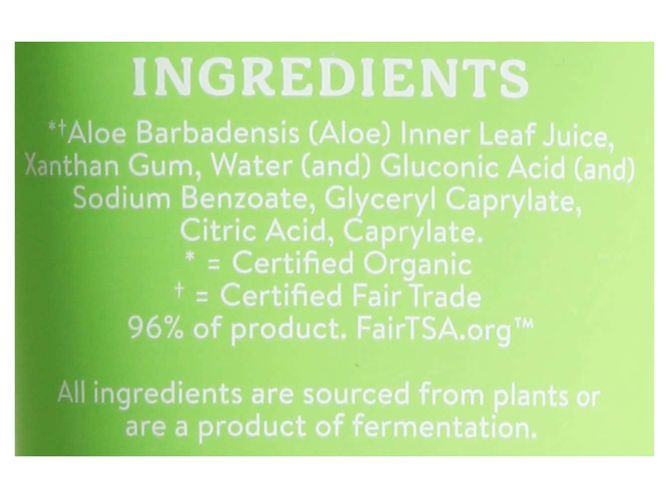 Ingredients: Aloe Barbadensis (Aloe) Juice (Certified Organic) (Certified Fair Trade), Xanthan gum, Water (and) Gluconic Acid (and) Sodium Benzoate, Glyceryl Caprylate, Citric Acid, Caprylate