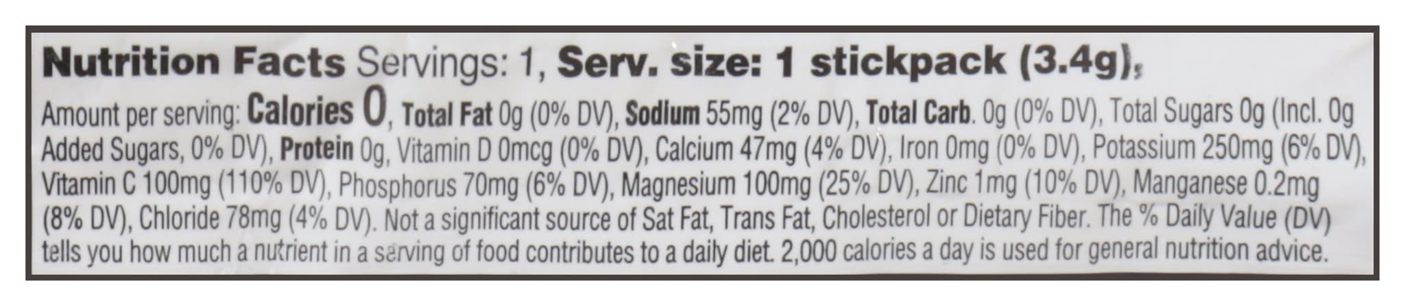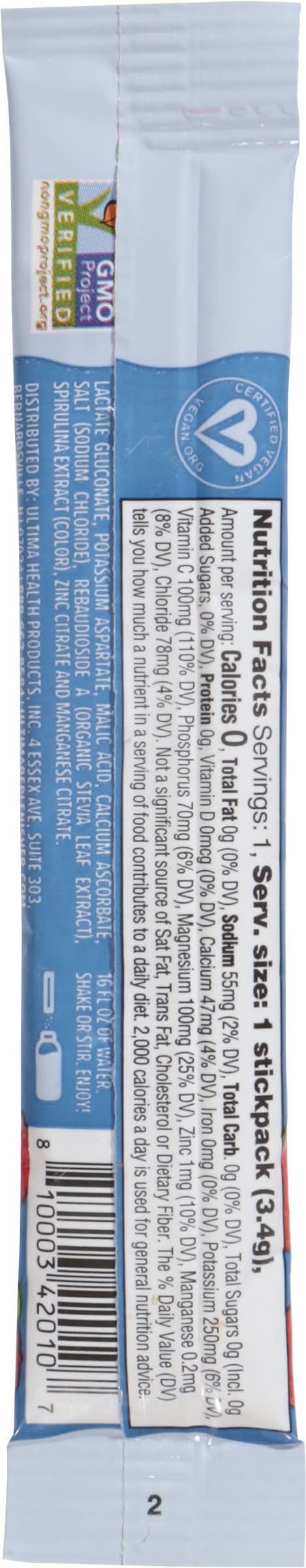 Ingredients: Magnesium Citrate, Citric Acid, Potassium Phosphate, Natural Raspberry and Blueberry Flavors (with Other Natural Flavors), Calcium Lactate Gluconate, Potassium Aspartate, Malic Acid, Calcium Ascorbate, Salt (Sodium Chloride), Rebaudioside a (Organic Stevia Leaf Extract), Spirulina Extract (Color), Zinc Citrate and Manganese Citrate