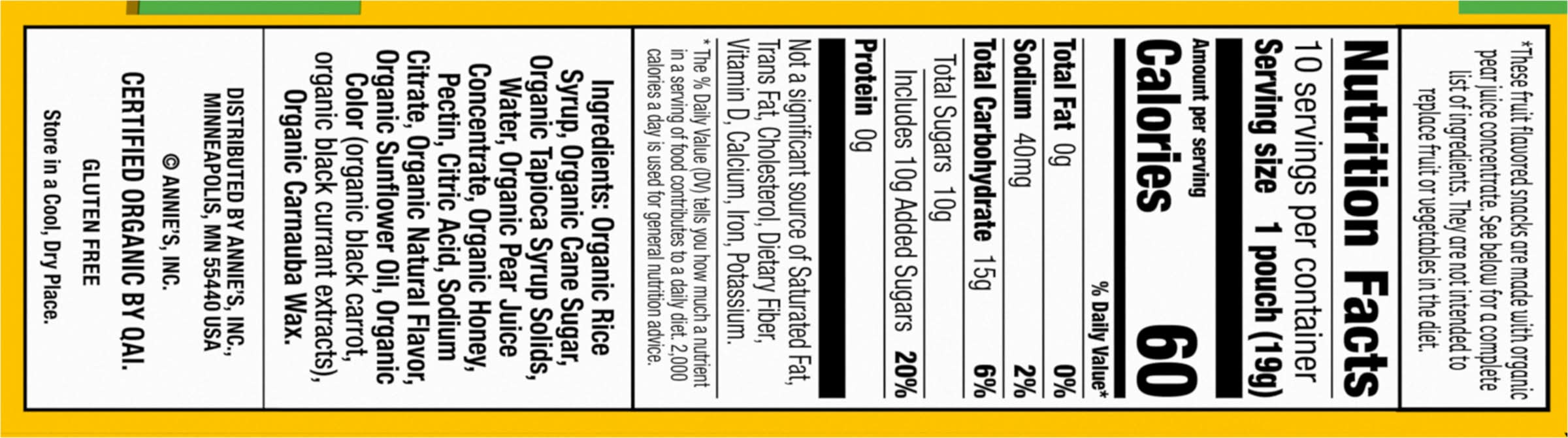 Ingredients: Organic Rice Syrup, Organic Cane Sugar, Organic Tapioca Syrup Solids, Water, Organic Pear Juice Concentrate, Organic Honey, Pectin, Citric Acid, Sodium Citrate, Organic Natural Flavor, Organic Sunflower Oil, Organic Color (Organic Black Carrot, Organic Black Currant Extracts), Organic Carnauba Wax