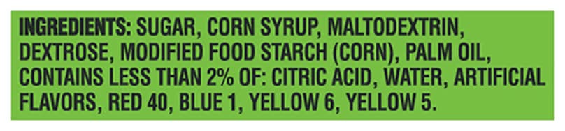 Ingredients: Sugar, Corn Syrup, Maltodextrin, Dextrose, Modified Food Starch (Corn), Palm Oil, Contains Less than 2% of: Citric Acid, Water, Artificial Flavors, Red 40, Blue 1, Yellow 6, Yellow 5 Contains: Corn
