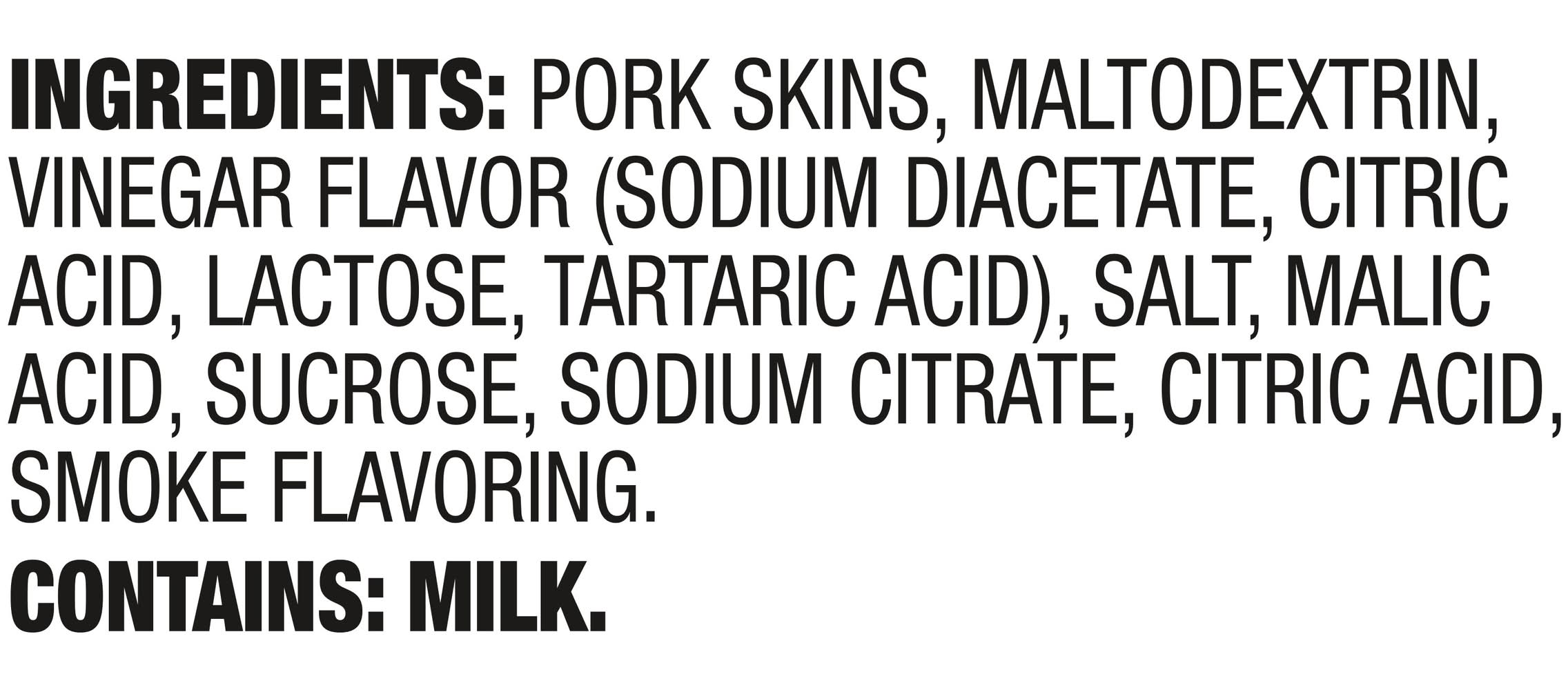 Ingredients: INGREDIENTS: PORK SKINS, MALTODEXTRIN, VINEGAR FLAVOR (SODIUM DIACETATE, CITRIC ACID, LACTOSE, TARTARIC ACID), SALT, MALIC ACID, SUCROSE, SODIUM CITRATE, CITRIC ACID, SMOKE FLAVORING. CONTAINS: MILK Contains: CONTAINS: Milk/Dairy