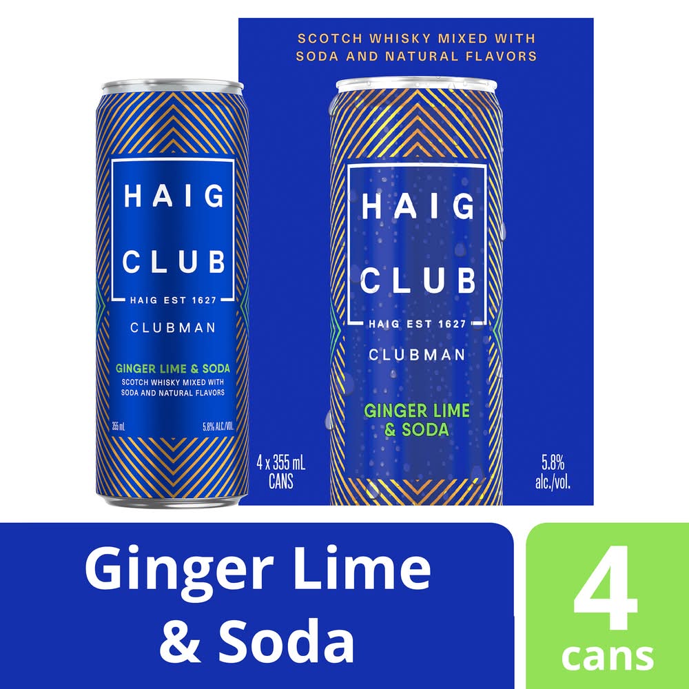 Celebrate any occasion with Haig Club Clubman Ginger Lime & Soda ready-to-drink canned cocktail. Featuring the wonderfully smooth taste of Haig Club Clubman Single Grain Scotch Whisky expertly mixed with fiery root ginger and finished with a twist of lime flavor, this cocktail offers an effortlessly delicious way to relax or celebrate. Simply enjoy chilled straight from the can or pour in a glass over ice with your favorite garnish. Includes four 5.8% alc./vol. 12 fl oz slim cans of Haig Club Clubman Ginger Lime & Soda. Please drink responsibly. • Pack size: 4 • Alcohol by volume: 5%