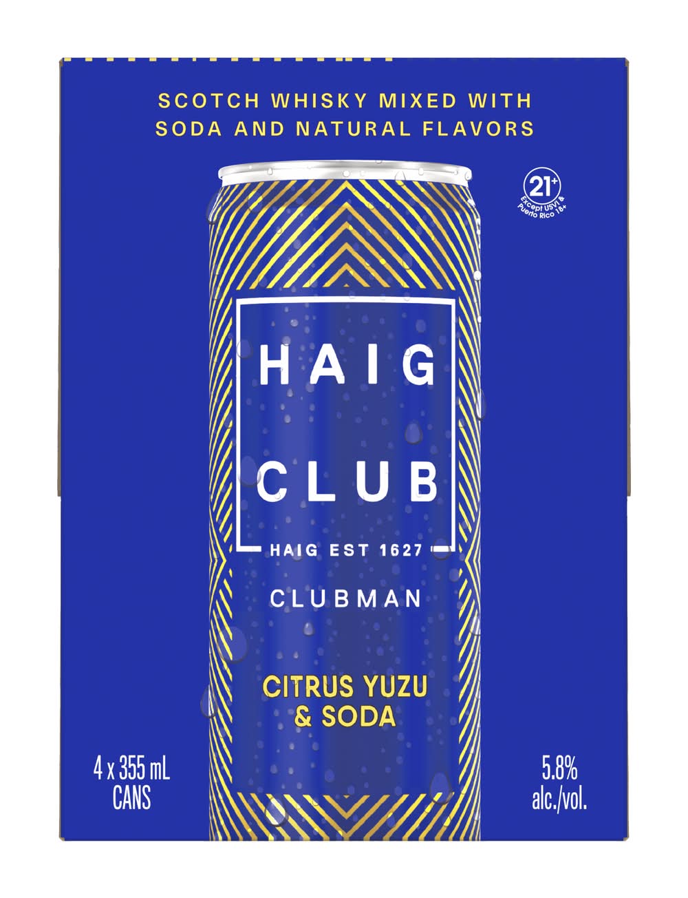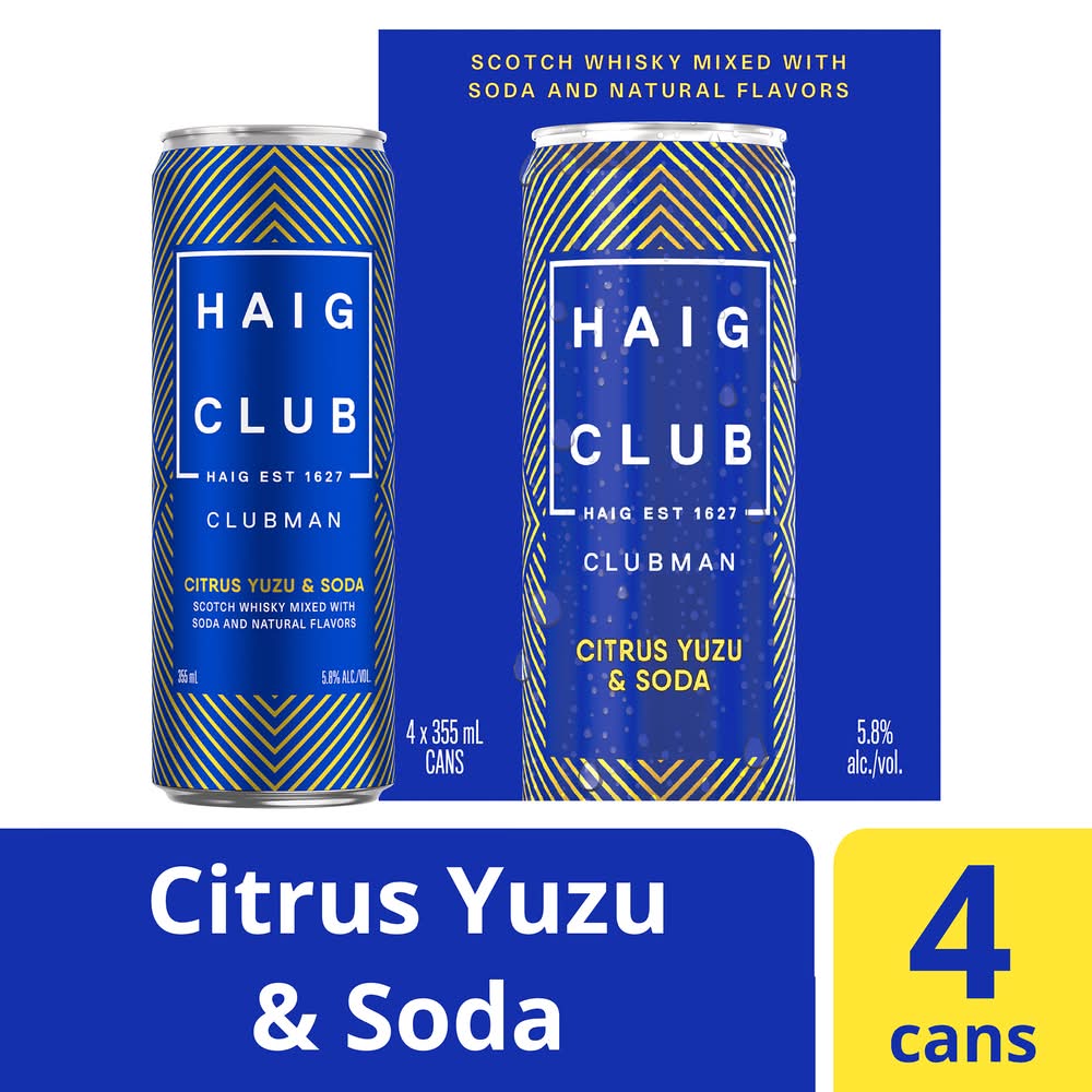 Celebrate any occasion with Haig Club Clubman Citrus Yuzu & Soda ready-to-drink canned cocktail. Featuring the wonderfully smooth taste of Haig Club Clubman Single Grain Scotch Whisky expertly mixed with bright citrus flavors, this cocktail offers an effortlessly delicious way to relax or celebrate. Simply enjoy chilled straight from the can or pour in a glass over ice with your favorite garnish. Includes four 5.8% alc./vol. 12 fl oz slim cans of Haig Club Clubman Citrus Yuzu & Soda. Please drink responsibly. • Pack size: 4 • Alcohol by volume: 5%