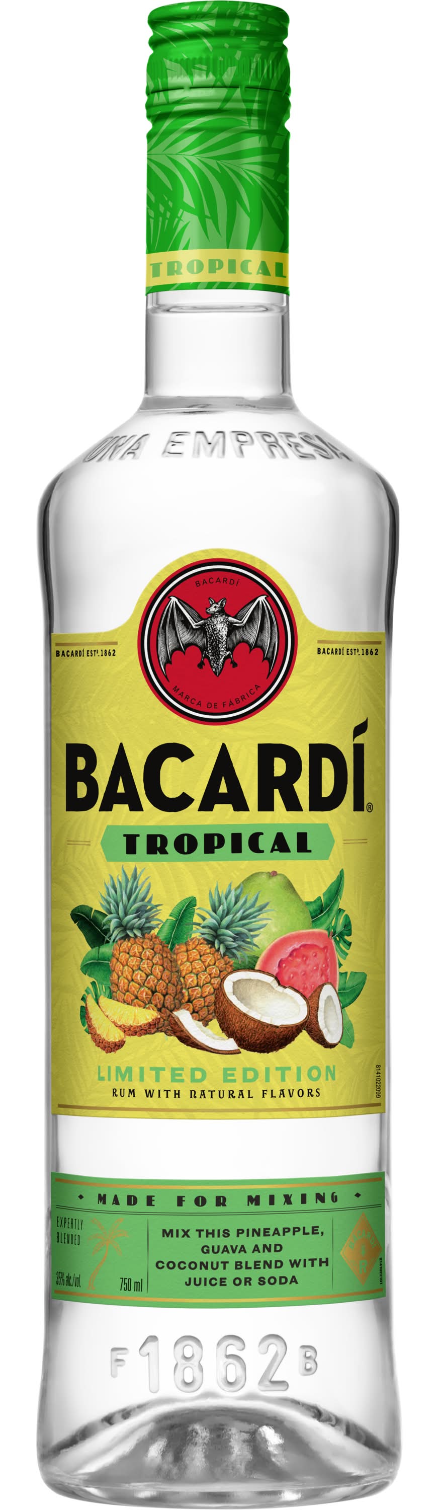 BACARD Tropical is a perfectly balanced blend of juicy pineapple, creamy coconut, and sweet guava. Nothing tastes more like summer than this limited edition, authentic BACARD Caribbean flavor that mixes well with juices and sodas. • Alcohol by volume: 35% • Packaging: Reusable