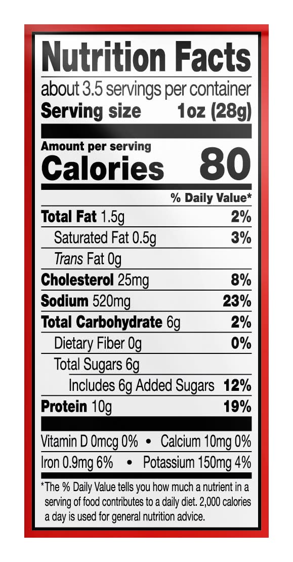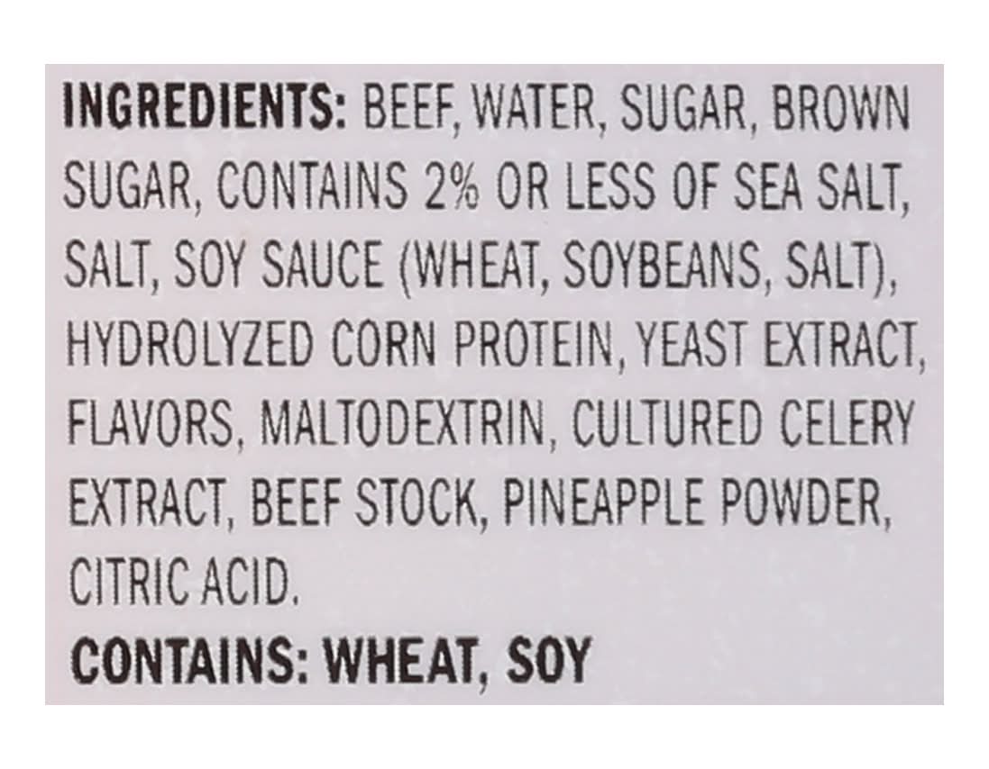 Ingredients: Beef, Sugar, Brown Sugar, Water, Contains 2% or Less of Salt, Beef Stock, Flavors, Vinegar, Soy Sauce, Wheat, Soybeans, Salt, Hydrolyzed Corn Protein, Yeast Extract, Maltodextrin, Citric Acid, Cherry Extract, Bromelain (From Pineapple) Contains: Yeast, Wheat, Soybeans, Corn
