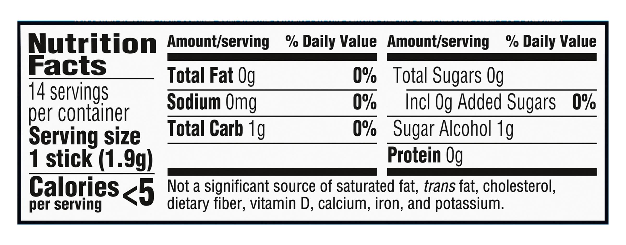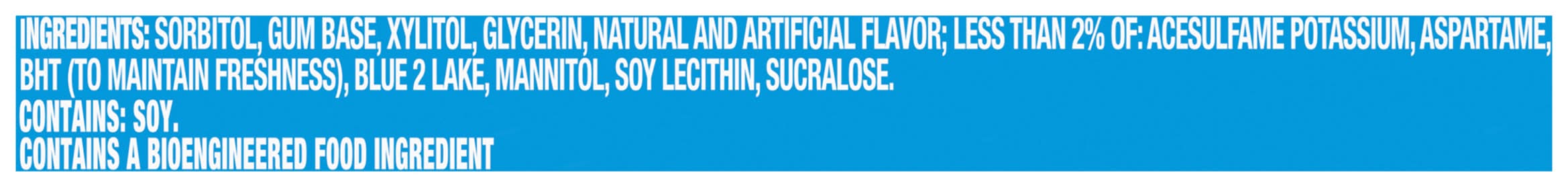 Ingredients: INGREDIENTS: SORBITOL, GUM BASE, XYLITOL, GLYCERIN, NATURAL AND ARTIFICIAL FLAVOR; LESS THAN 2% OF: ACESULFAME POTASSIUM, ASPARTAME, BHT (TO MAINTAIN FRESHNESS), BLUE 2 LAKE, MANNITOL, SOY LECITHIN, SUCRALOSE. Contains: PHENYLKETONURICS: CONTAINS PHENYLALANINE brCONTAINS: SOY.