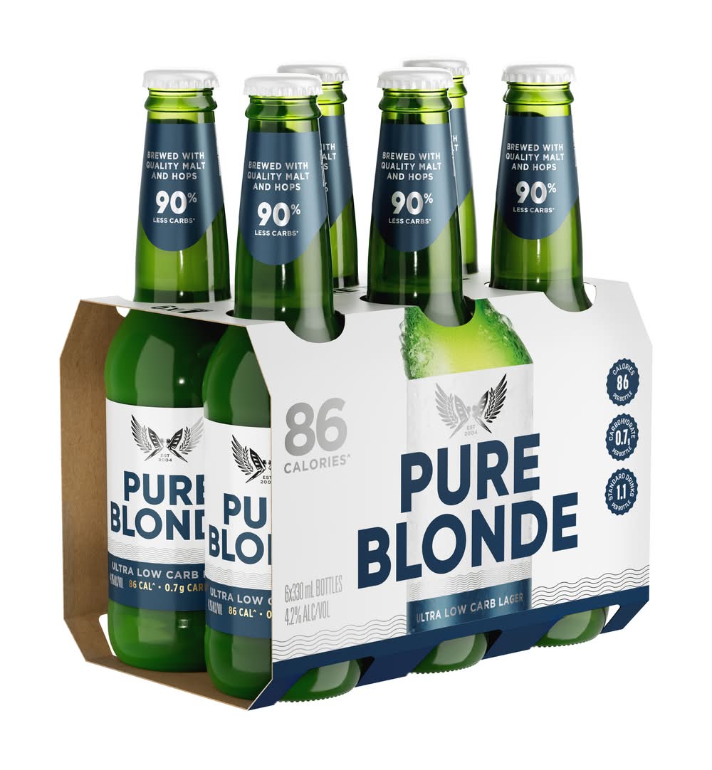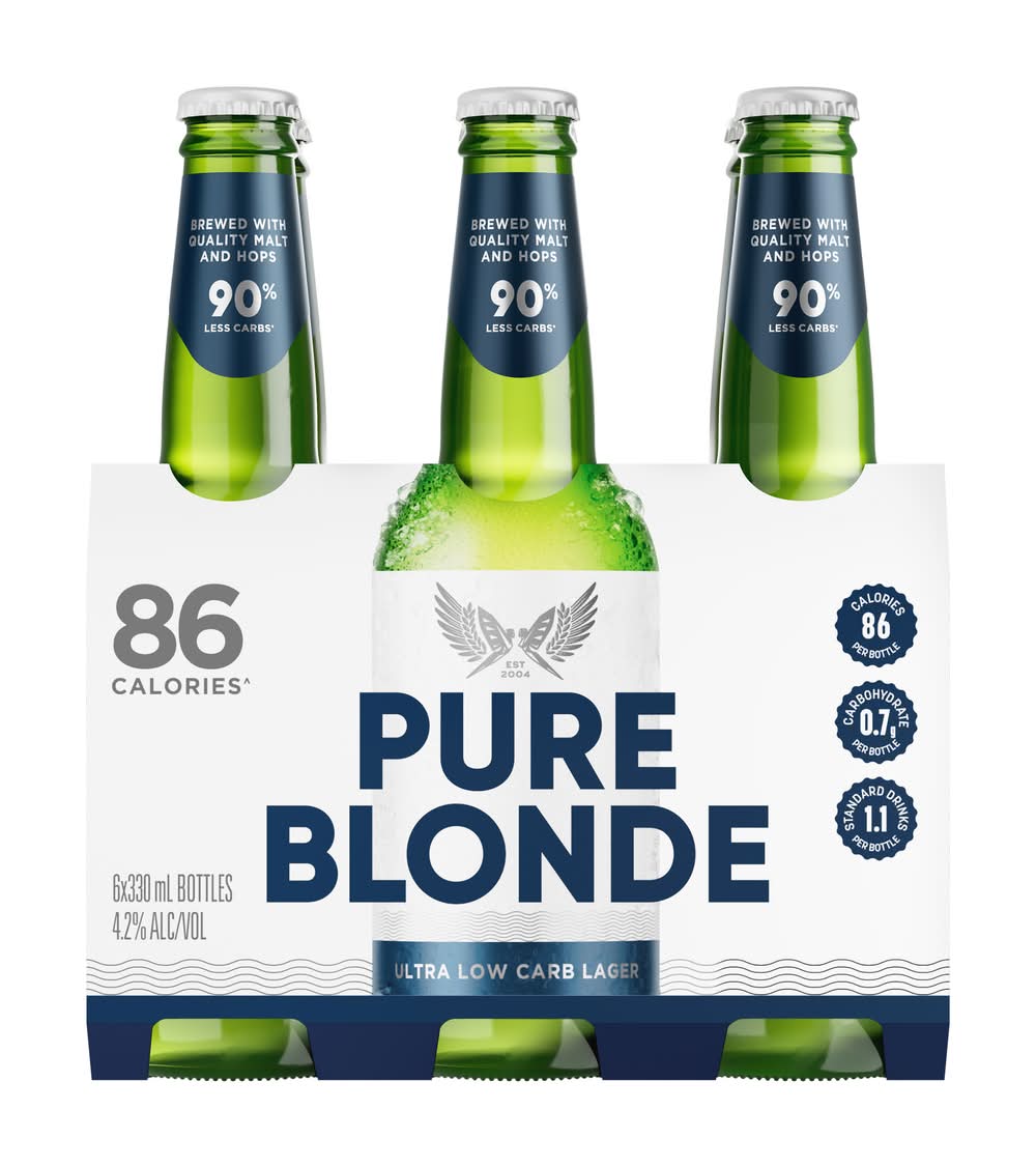 Pure Blonde, Australia’s much loved Ultra Low Carb Beer is an easy drinking, full flavoured lager with a refreshing taste. At 98 calories^ and 90% less carbs* it’s no surprise it comes from a place purer than yours. Pure Blonde is made from pale malt, Australian Pride of Ringwood family hops for bitterness and European Hersbrucker hops added to the kettle for aroma and flavour. With a pale amber, bright golden glow and subdued foam, Pure Blonde has an aromatic green, herbal hop nose and moderate floral and fruity notes. Its light malt character delivers a smooth, easy drinking, crisp finish. ^Per Can *Than VB • Brand: Pure blonde • Pack size: 6 • Alcohol by volume: 4.2%