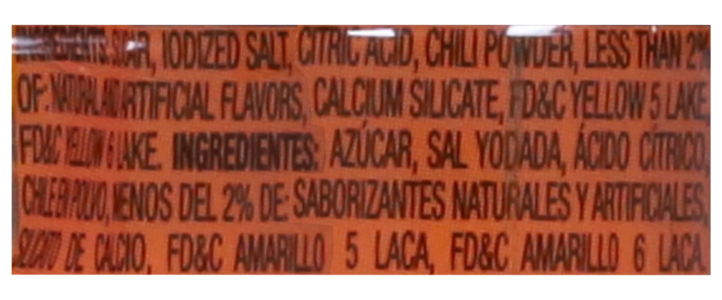 Ingredients: Sugar, Iodized Salt, Citric Acid, Chili Powder, Less than 2% of: Natural Artificial Flavors, Calcium Silicate, FD&C Yellow 5 Lake, FD&C Yellow 6 Lake