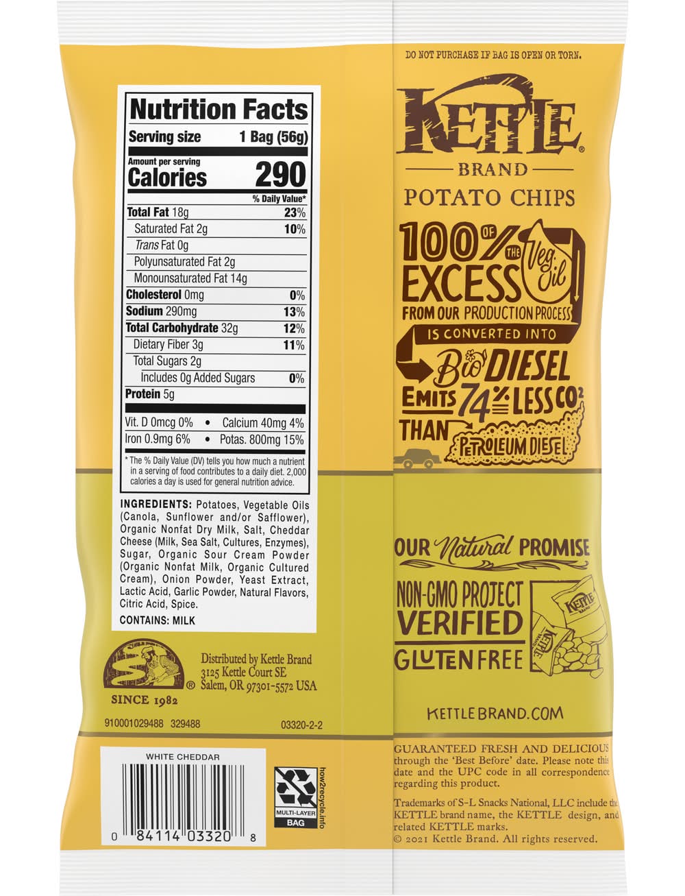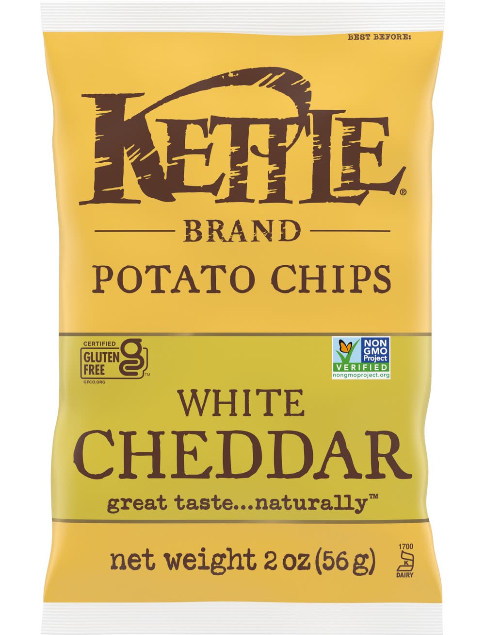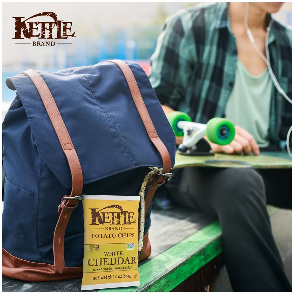 Kettle Brand White Cheddar kettle chips start with a search for undisputed potato excellence. Determined not to disrupt the flawless, spudsy goodness, these perfectly sliced beauties are kettle cooked, skin on, one batch at a time. Next, they’re seasoned for big flavor. That’s where the big cheese comes into play, delivering seriously cheesy snacking nirvana. You’ll love the satisfying flavor of sharp white cheddar in each delicious bite. When you open a bag of our Kettle Brand potato chips, you know you're getting incredible kettle chips made with authentic recipes by real people. From their farms to our kitchens and then to your home, the time and attention every Kettle Brand worker puts into their products is care you can trust. All that, plus Kettle Brand chips deliver a delicious snack that’s non-GMO Project Verified, and Certified Gluten-Free. These 2-ounce snack bags of kettle chips are great at home or on-the-go. Kettle Brand potato chips. Extra in a good way. • Brand: Kettle brand • gluten-free, GMO-free • Number of servings: 1 • Packaging: Reusable