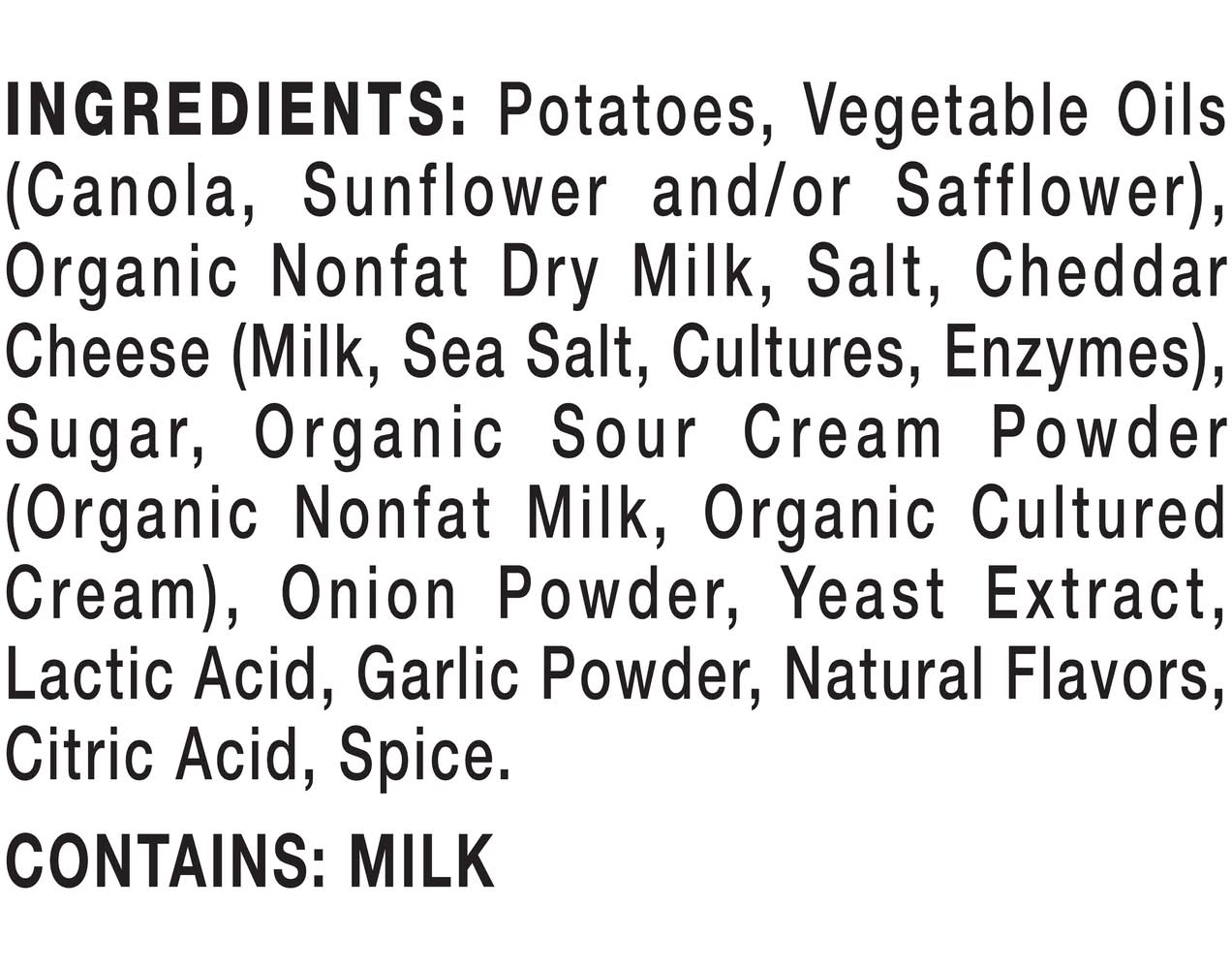 Ingredients: INGREDIENTS: POTATOES, VEGETABLE OILS (CANOLA, SUNFLOWER AND/OR SAFFLOWER), ORGANIC NONFAT DRY MILK, SALT, CHEDDAR CHEESE (MILK, SEA SALT, CULTURES, ENZYMES), SUGAR, ORGANIC SOUR CREAM POWDER (ORGANIC NONFAT MILK, ORGANIC CULTURED CREAM), ONION POWDER, YEAST EXTRACT, LACTIC ACID, GARLIC POWDER, NATURAL FLAVORS, CITRIC ACID, SPICE. CONTAINS: MILK. Contains: CONTAINS: Milk/Dairy