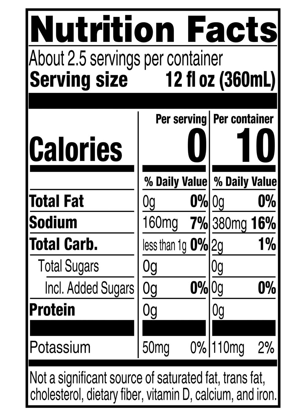 Ingredients: Water, Citric Acid, Sodium Citrate, Natural Flavor, Salt, Monopotassium Phosphate, Modified Food Starch, Sucralose, Acesulfame Potassium, Glycerol Ester Of Rosin, Red 40, Blue 1
