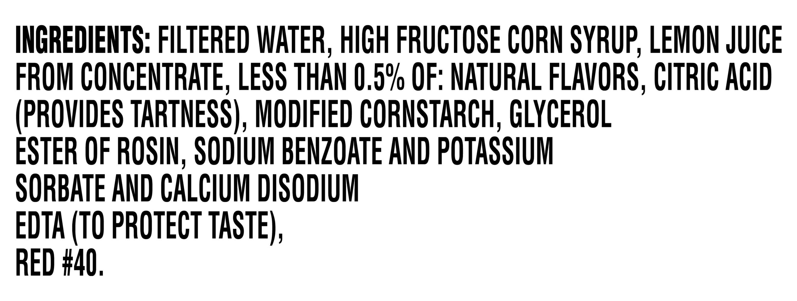 Ingredients: Pure Filtered Water, High Fructose Corn Syrup, Lemon Juice From Concentrate, Less Than 0.5% Of: Natural Flavors, Citric Acid (Provides Tartness), Modified Cornstarch, Glycerol Ester Of Rosin, Sodium Benzoate And Potassium Sorbate And Calcium Disodium Edta (To Protect Taste), Red #40. Contains: Corn (Maize)